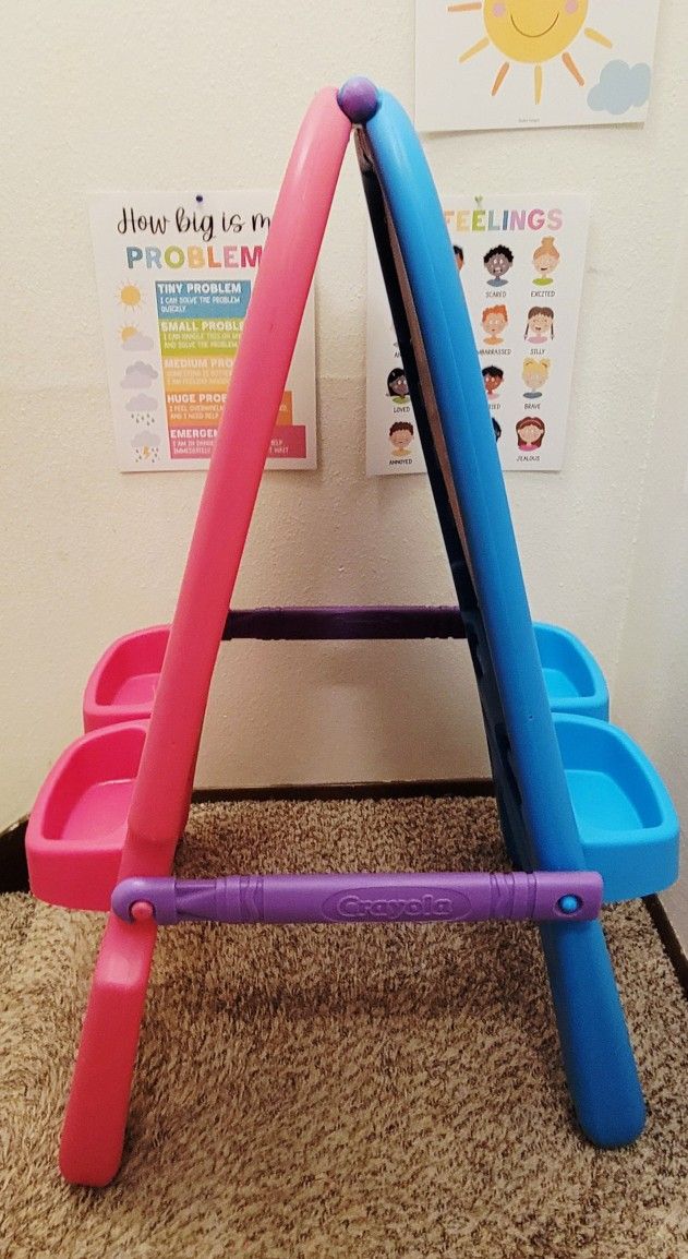 This has been used by both my kids, they used it alone and together on their own sides. We put this in front of an area where one of my kids loved to draw on the walls. Voila! Solved a problem and they created some amazing masterpieces! Crayola double sided easel 41inches tall One side dry erase which is magnetic One side chalk board not magnetic Both have top clips for crafting paper to use as a painting easel. The cubbies are removable for easy cleaning
