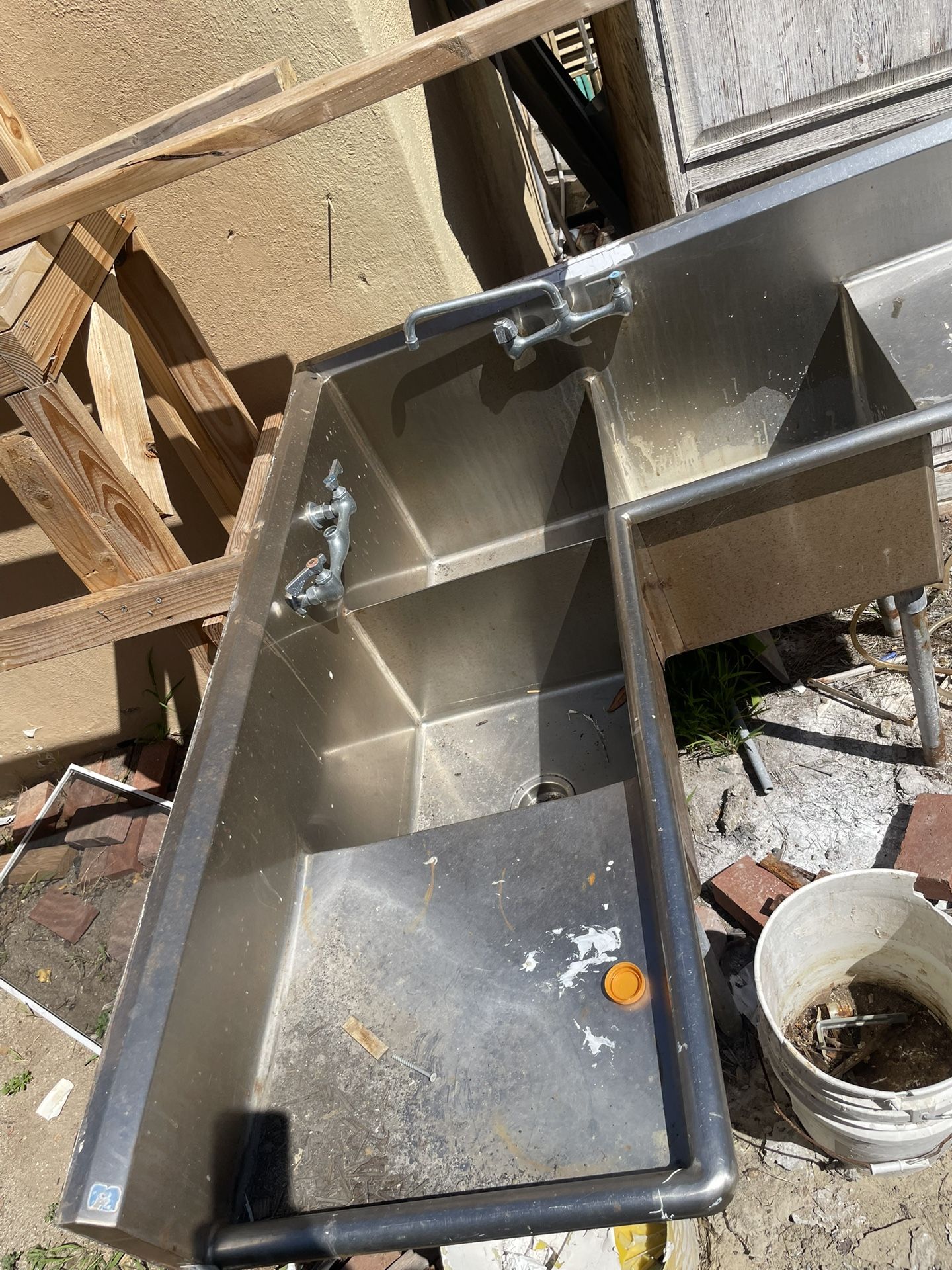 commercial stainless steel 3-compartment prep sink with drainboards and faucets.