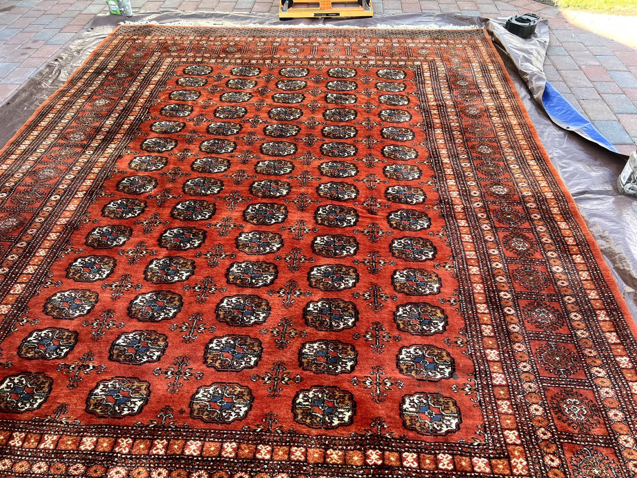 Tekke Bokhara 9’6” X 12’11”, 100% Virgin Lamb’s Wool this type of rug is passed from generation to generation since down sizing in our move to Florida we have no place for it, it is in very good condition there are no stains, holes, cuts, rips. We had this rug in our living room in our home in Tennessee. This is the type of rugs you see in law offices, If you are a Snowbird you can put it in the trunk of car and take back north with you. These oriental fold up see pictures because they are shipped here. The don’t have the stiff backing to keep them together like machine made imitation Oriental rugs