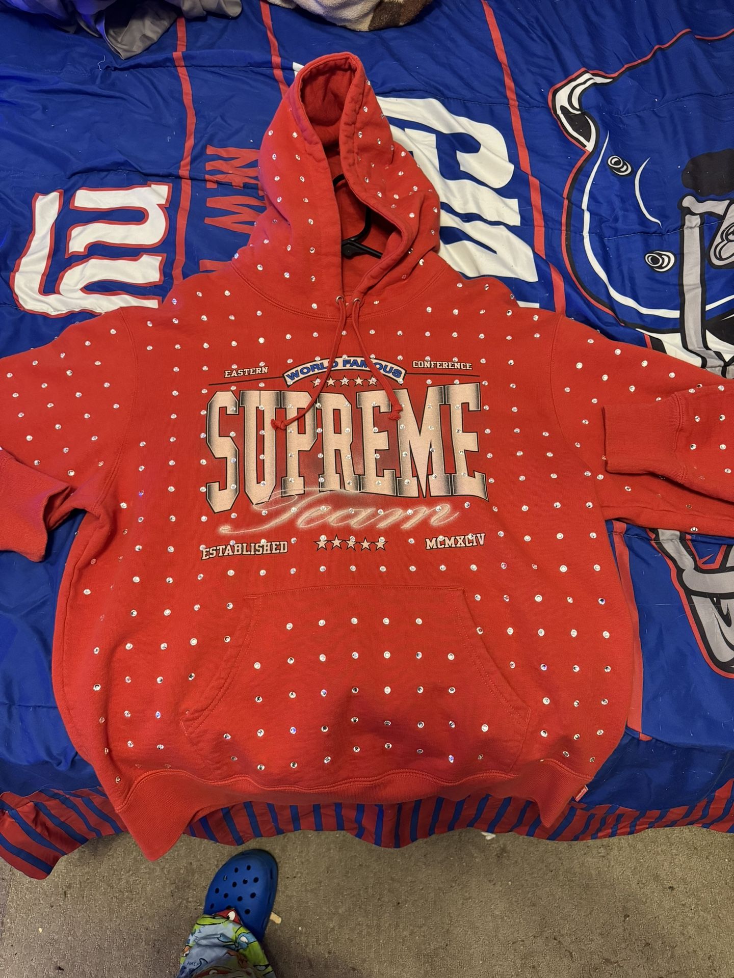 Red rhinestone supreme hoodie size medium Only worn 2-3 times, basically brand new All stones are still on and none look / feel loose Originally from fly shack, 100% authentic supreme