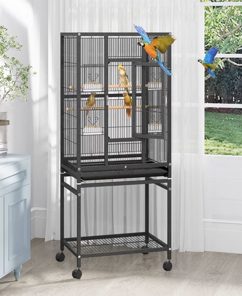 Parrot-Proof Lock-No Escape, Even for Smart Birds: Glossy secure lock specially designed for parakeets, cockatiels, and parrots - smarter than traditional latches! No way to open it, ensuring your feathered friends stay safe inside. Slide-Out Tray & Wrought Iron Wire-1-Minute Cleanup: Large slide-out tray catches bird droppings and food scraps - just pull, dump, and wipe! Durable wrought iron wire resists rust and stains, no more scrubbing hard-to-reach corners. Spacious 24"×17"×53" Cage-Perfect for 2-3 Birds: Extra-large flight space for budgies, parakeets, lovebirds, cockatiels, or small parrots to stretch wings! Ample room for perches, and feeders-happy birds-quieter, less destructive pets. 360° Swivel Wheels + Storage Rack-Move & Organize Effortlessly: 4 universal wheels glide smoothly on any floor-relocate your bird cage in seconds! Built-in storage rack holds bird food, and supplies-no more cluttered pet space!