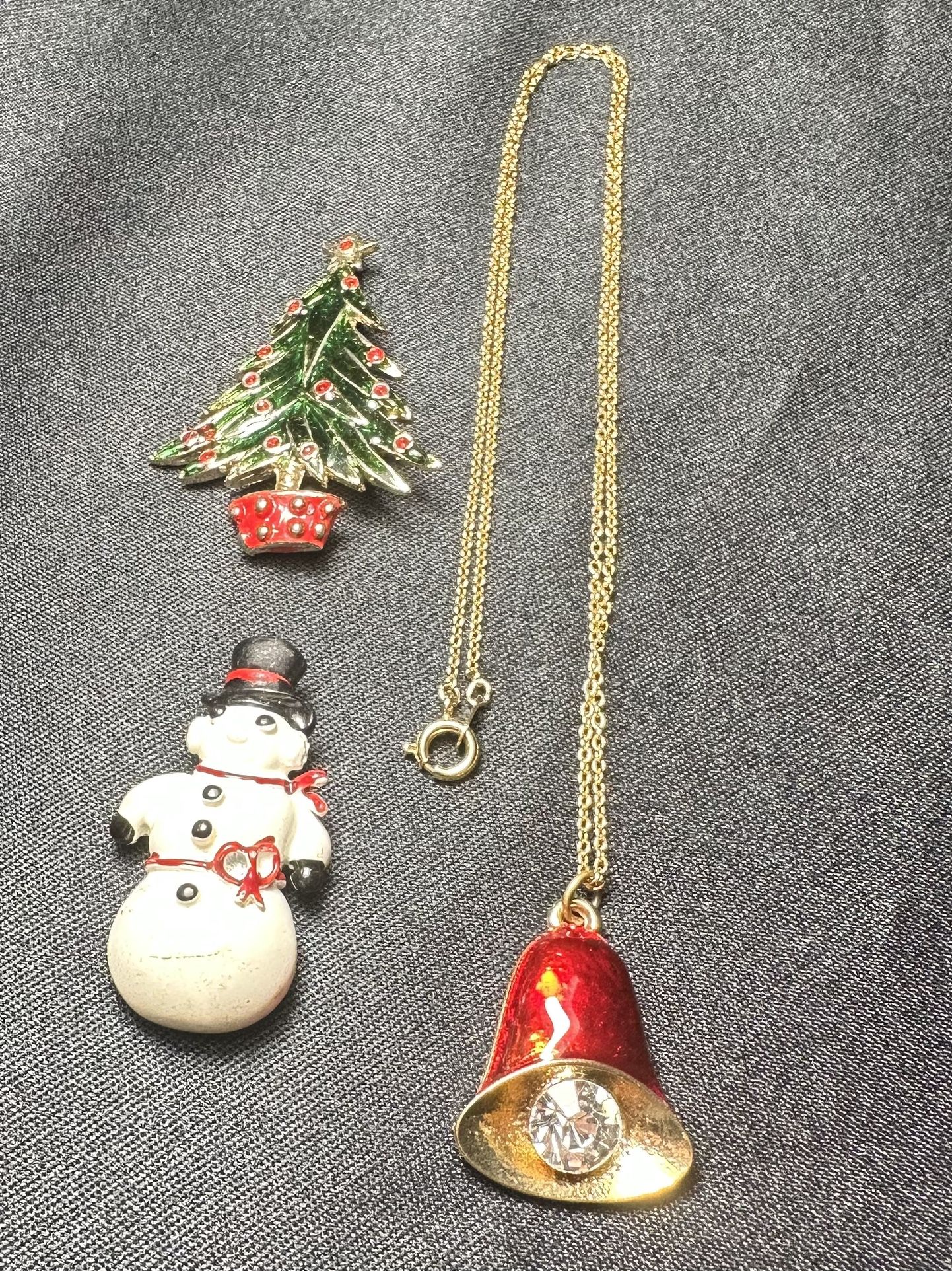 CHRISTMAS - VINTAGE BROOCHES ~ CHRISTMAS BELL NECKLACE, SNOWMAN, CHRISTMAS