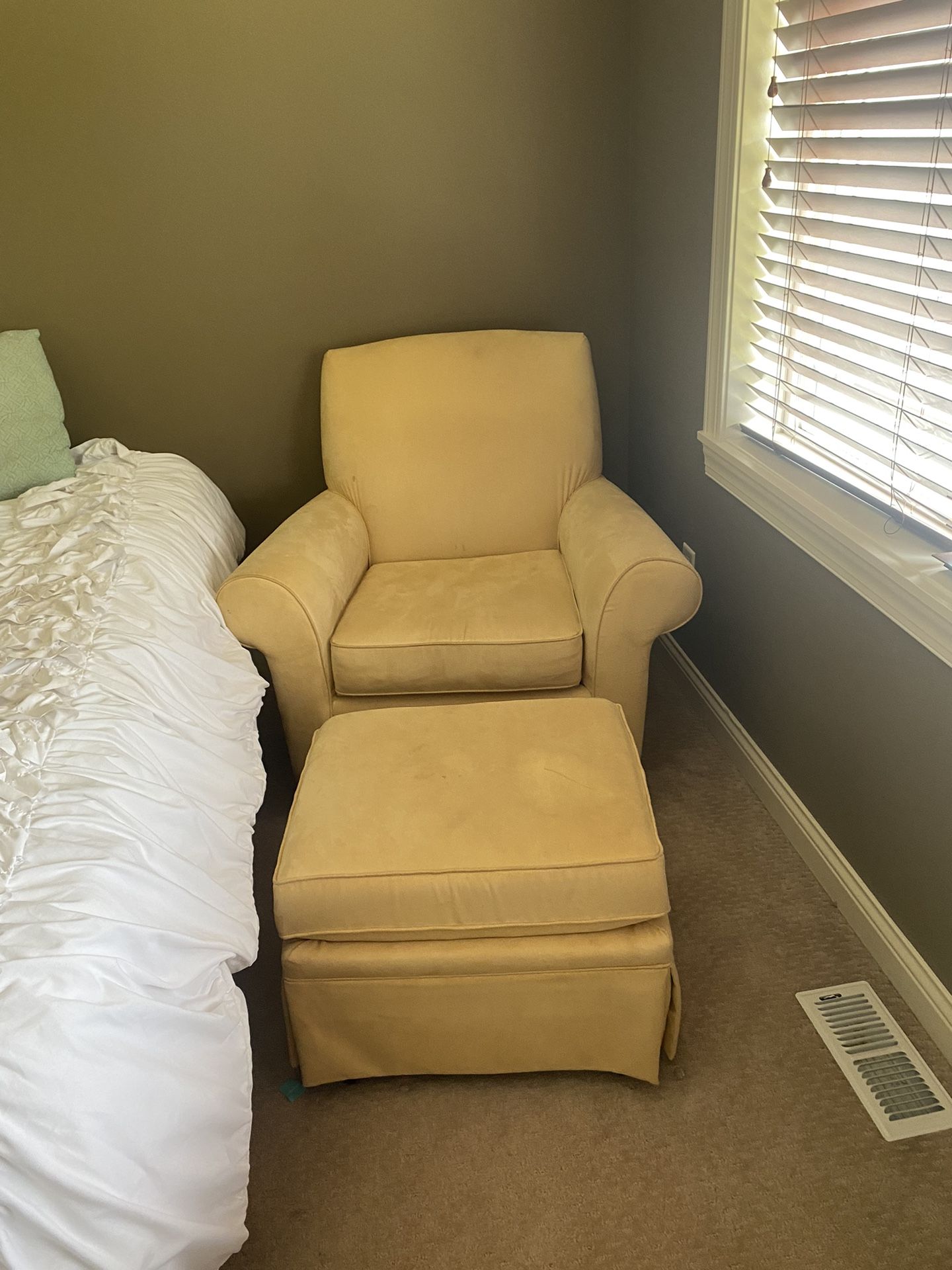 Softest suede like material, neutral yellow color. Ottoman has rocker. Yellow main chair swivels and rocks. Great to sit and read in but puts you to sleep! I used this when the littles were babies but it now just sits in the guest room without much need. Smoke free home. Pets in the home. Delivery for a fee. I can help you load.
