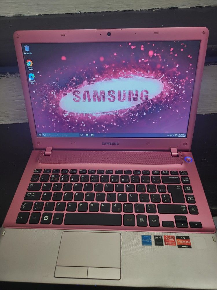 Pink Samsung Laptop Fresh install of Windows 10 Pro Complete Office suite (Word, Excel, powerpoint,etc.) 15 inch screen AMD 2.3Ghz processor 4Gb Ram HD Camera 256Gb SSD Usb Bluetooth Multicard reader HDMI DvD RW New charger 3 hour battery Runs great! GREAT condition! Don't miss out! I fix systems as well!