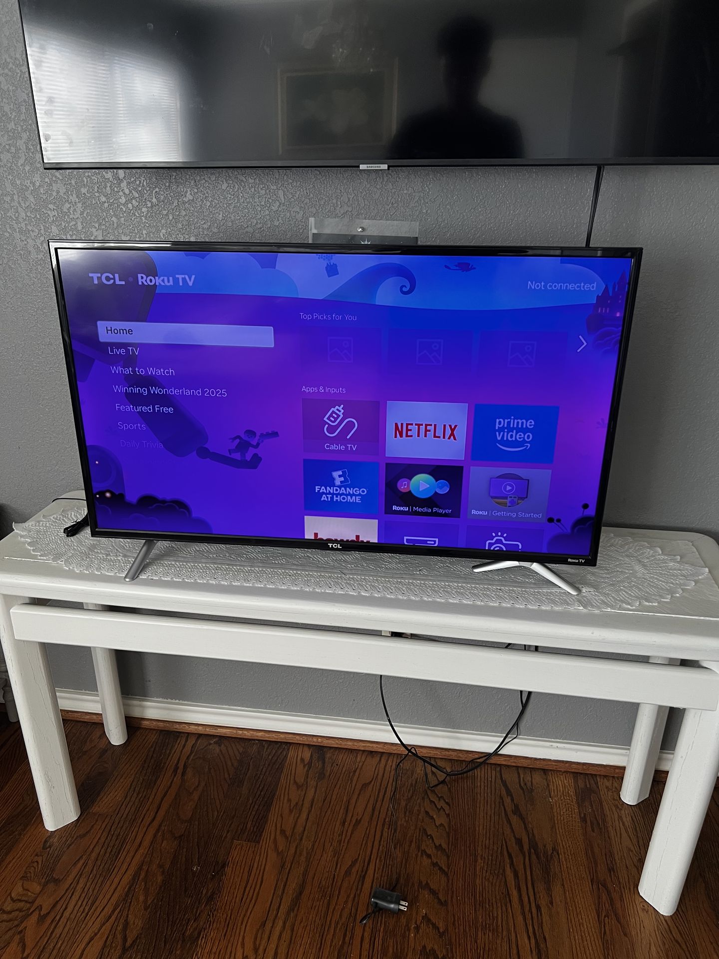 40’ inch Roku TV No remote but can be controlled with the Roku app Been sitting in our garage Just trying to get rid of it