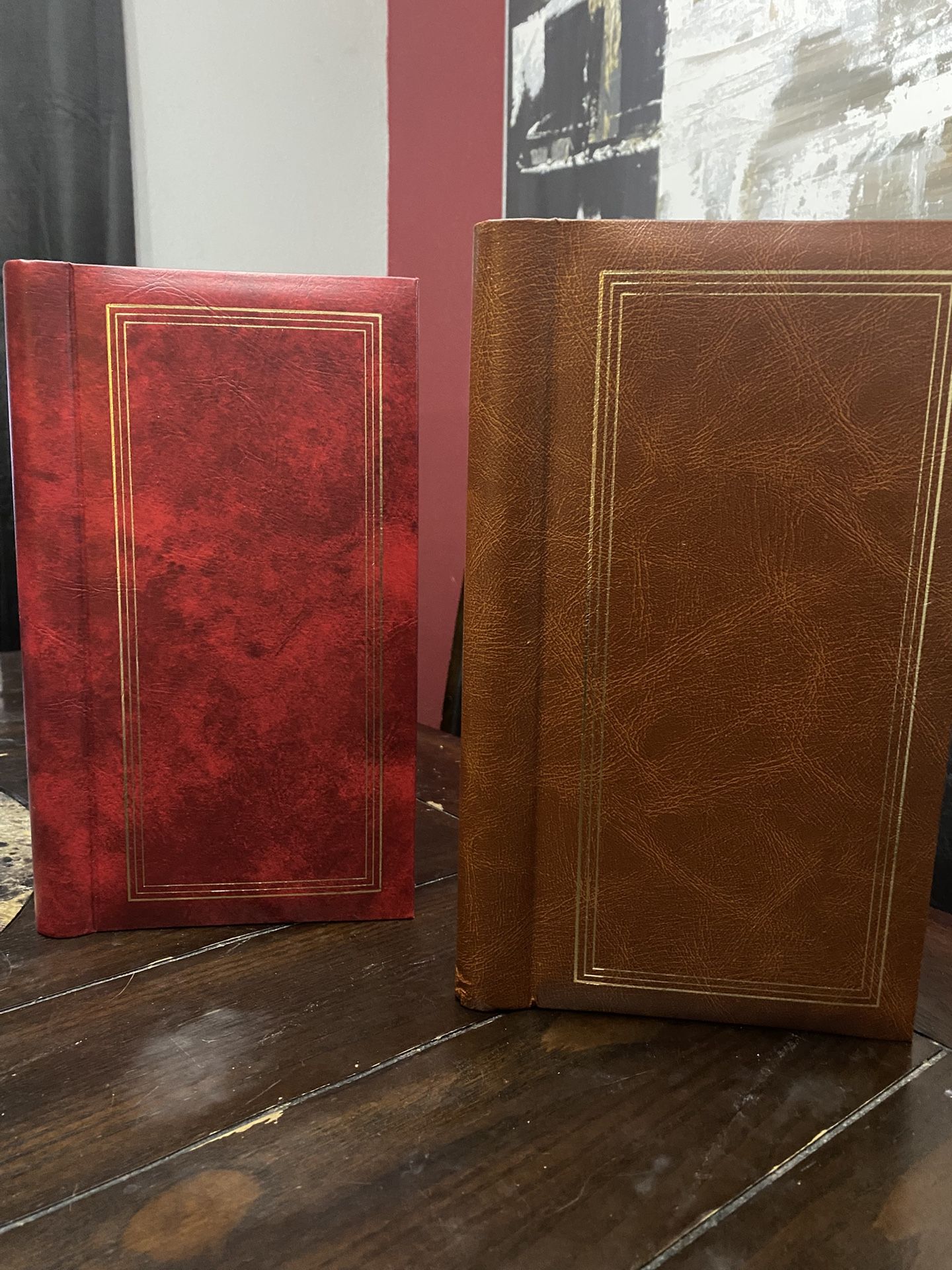 Leather covered photo albums, designed for 4x6 photos and pages fold out for double the photographs. No notable damage, simply don’t need! Make me an offer.