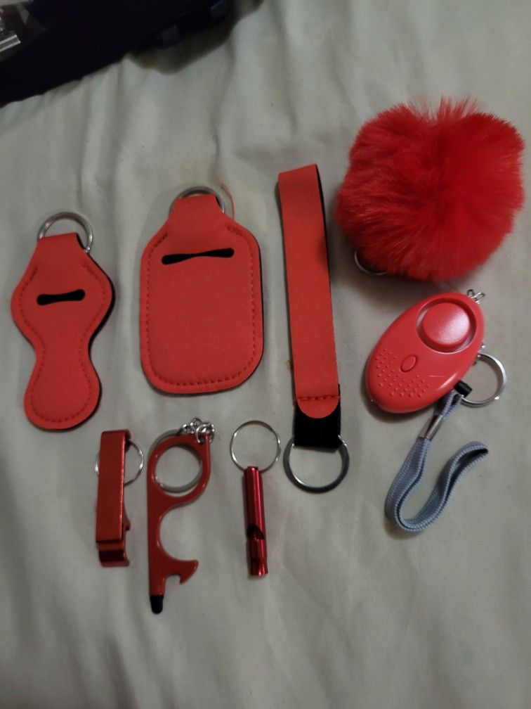 8 in 1 red safety keychain set. Wristlet, personal alarm, pom pom, whistle, no touch tool, sanitizer holder, and chapstick holder.