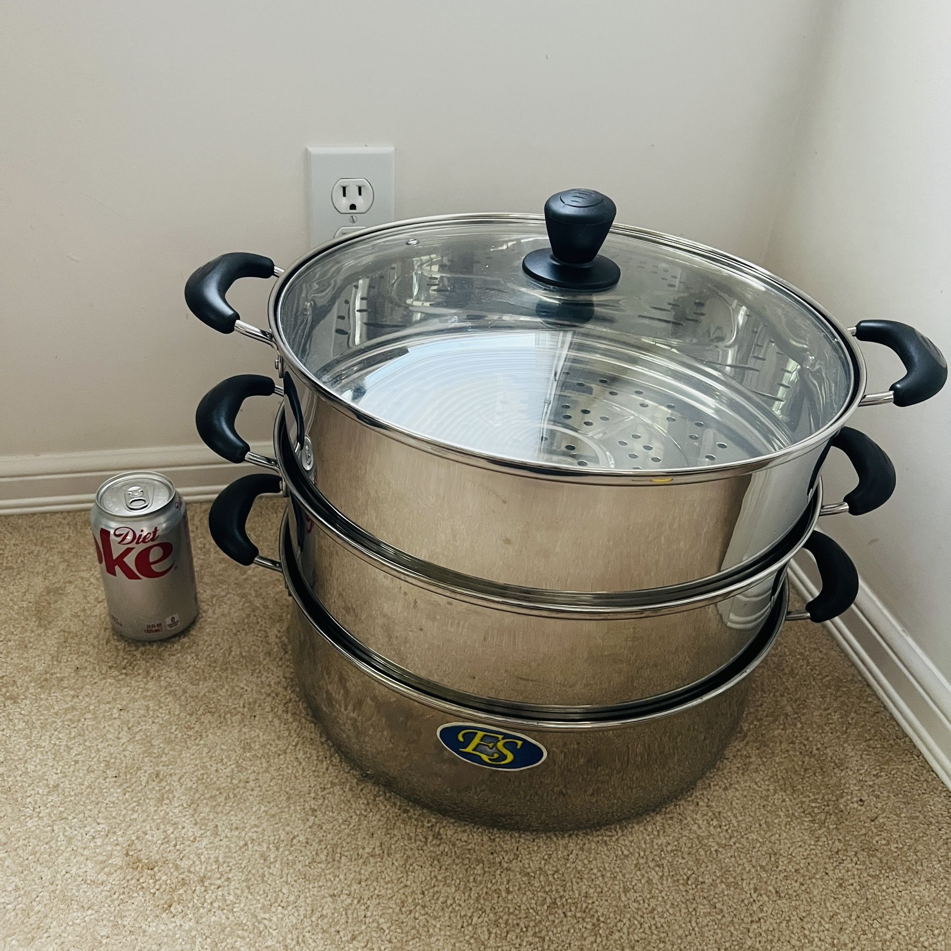 ES Steamer Cooker Cookware Steaming Pot pan Stainless Steel. Rare Large Big 14" 36cm 3 Layers vs Glass lid. Width 18" x 14", 12" height Each layer is 4.5" deep Great condition family friend holiday gift home office kitchen work birthday anniversary valentines house warming wedding valentine's day mother father Christmas Halloween Thanksgiving party chef guest moving downsizing college dorm apple apartment storage traveling vocation computer laptop cellphone google designer ikea dania dinning room university student college moving target Macy's Wayfair amazon Costco bravern graduation bedroom bathroom authentic Walmart Nordstrom Sam's club