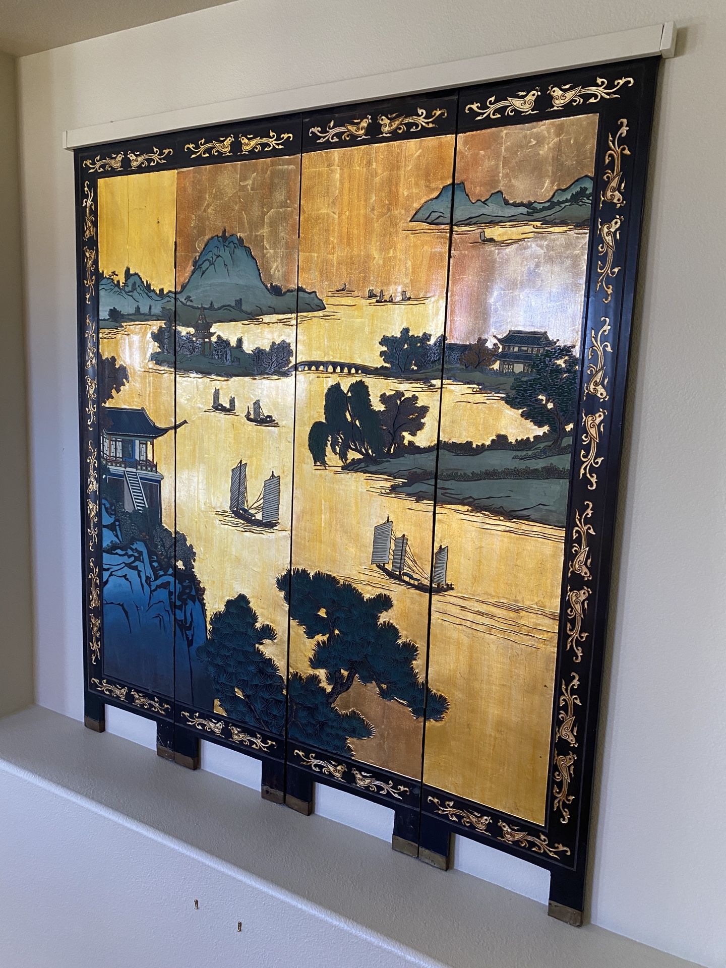 This is a four panel Chinese Coromandel Screen. This screen is somewhat unique as it portrays a scene overlooking a bay rather than birds and flowers. However, the reverse side is more traditional with birds, flowers, etc., as the one panel from a similar screen shows. It is mounted in a niche above a staircase so I couldn’t take a picture of its reverse side. Each panel is 16 inches wide and 72 inches tall. Use as a standalone art object or as a room divider.