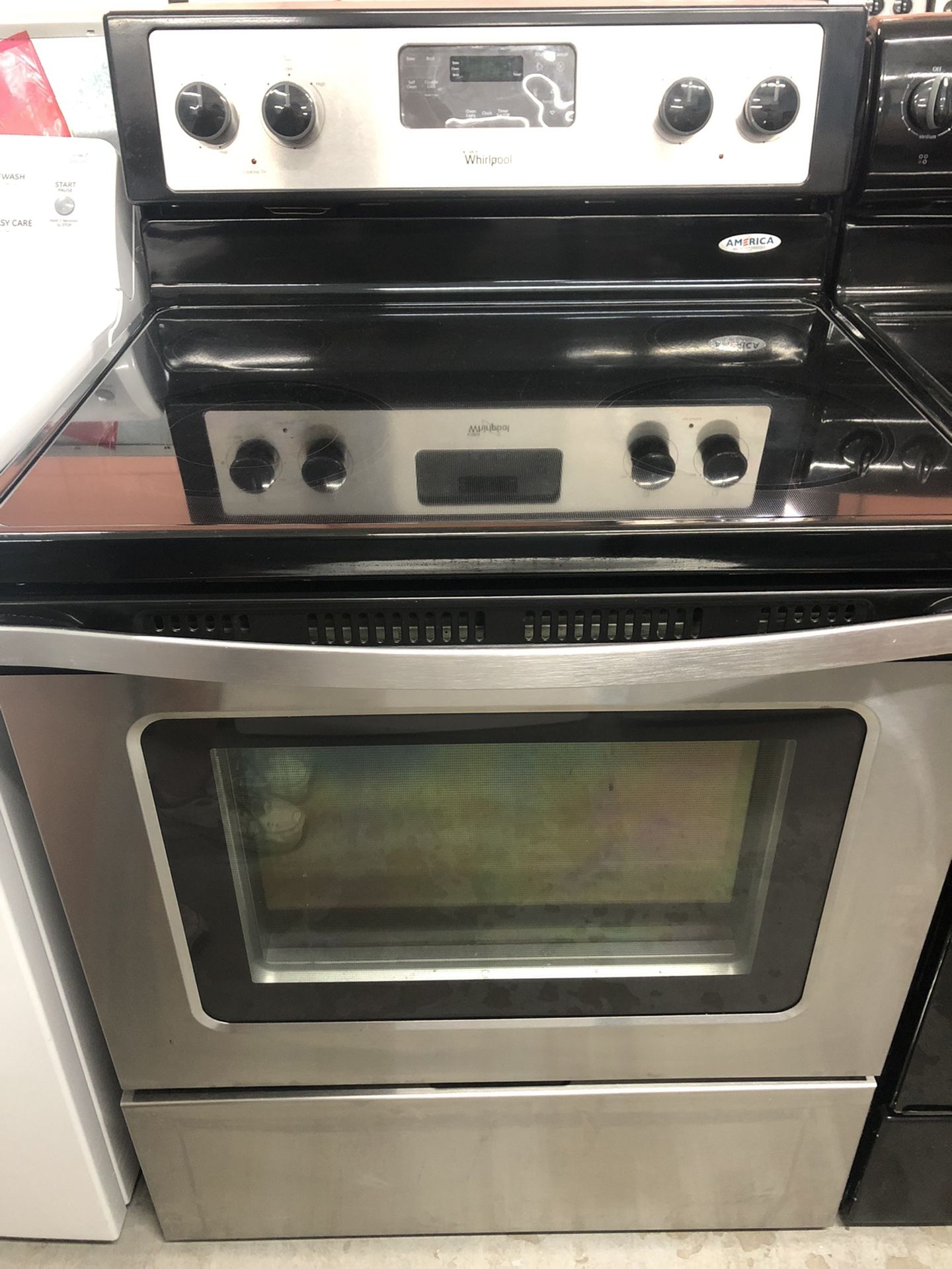 Whirlpool 4 burner self clean glass top stove. Top has 2 large burners,one is expandable, and 2 small burners. Easy to use digital clock with one touch self clean and custom broil. Large oven with light and window in the door. Comes with warranty. Financing and delivery available.