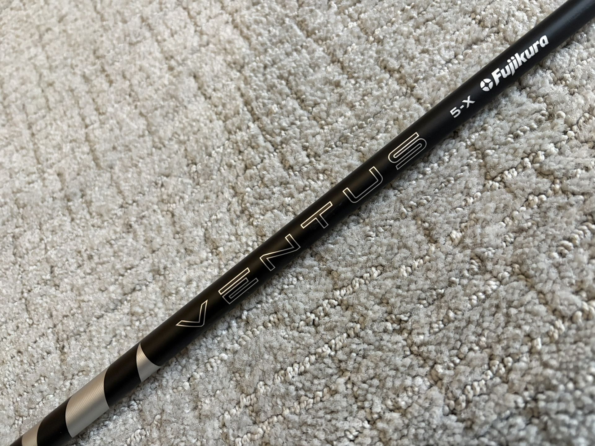 Fujikura’s newest Ventus shaft, the 2025 Ventus Black Velocore+, in a light but stiff 5x flex. It’s fitted with a Callaway adapter and a standard Tour Velvet grip, and measures 44.5” as shown, for right around a standard 45.5” playing length.