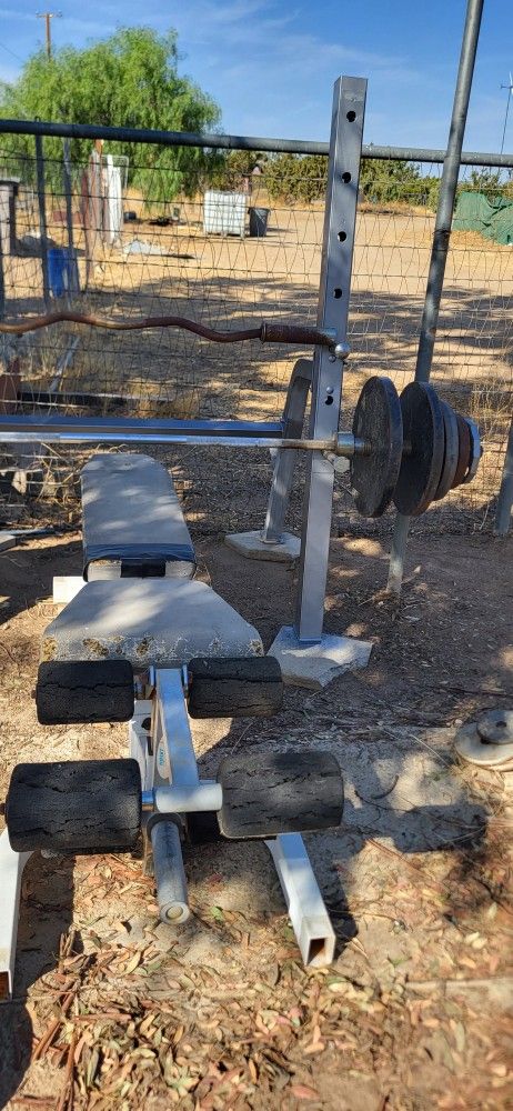 Heavy Duty bench adjustable hoist brand Sqatt Rack station weight holders Pairs of 45s 35s 25s 10s 5s Olympic barbell and curling bar $350