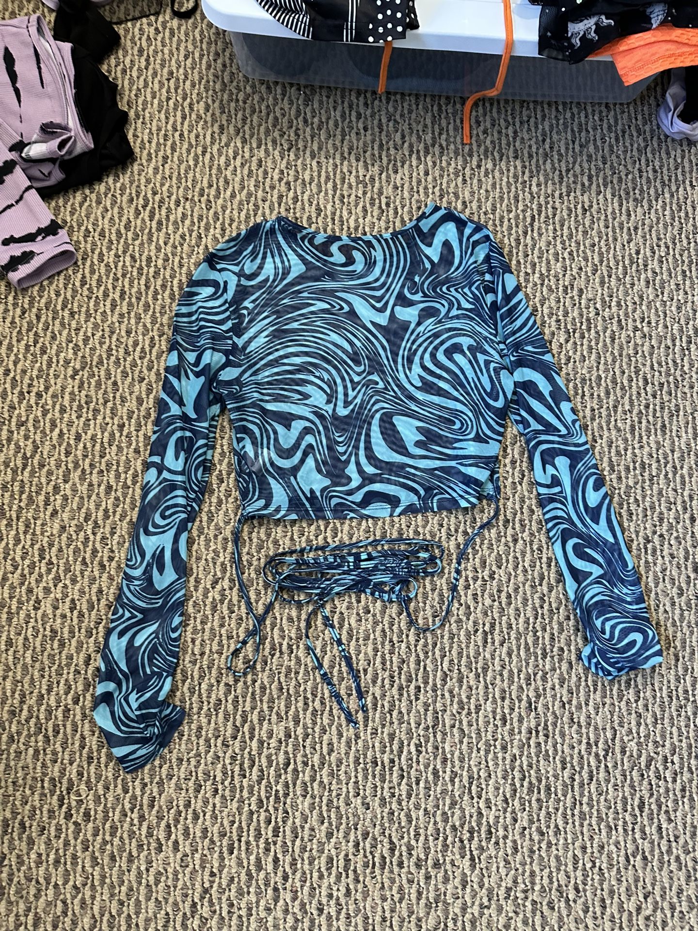 Perfect for festivals or rave nights! • Lightweight mesh material • Long sleeve, stretchy fit • Eye-catching blue swirl design • Adjustable tie front detail Gently used, in great condition. Selling for less than $5 — just clearing out space! DM for pickup info!