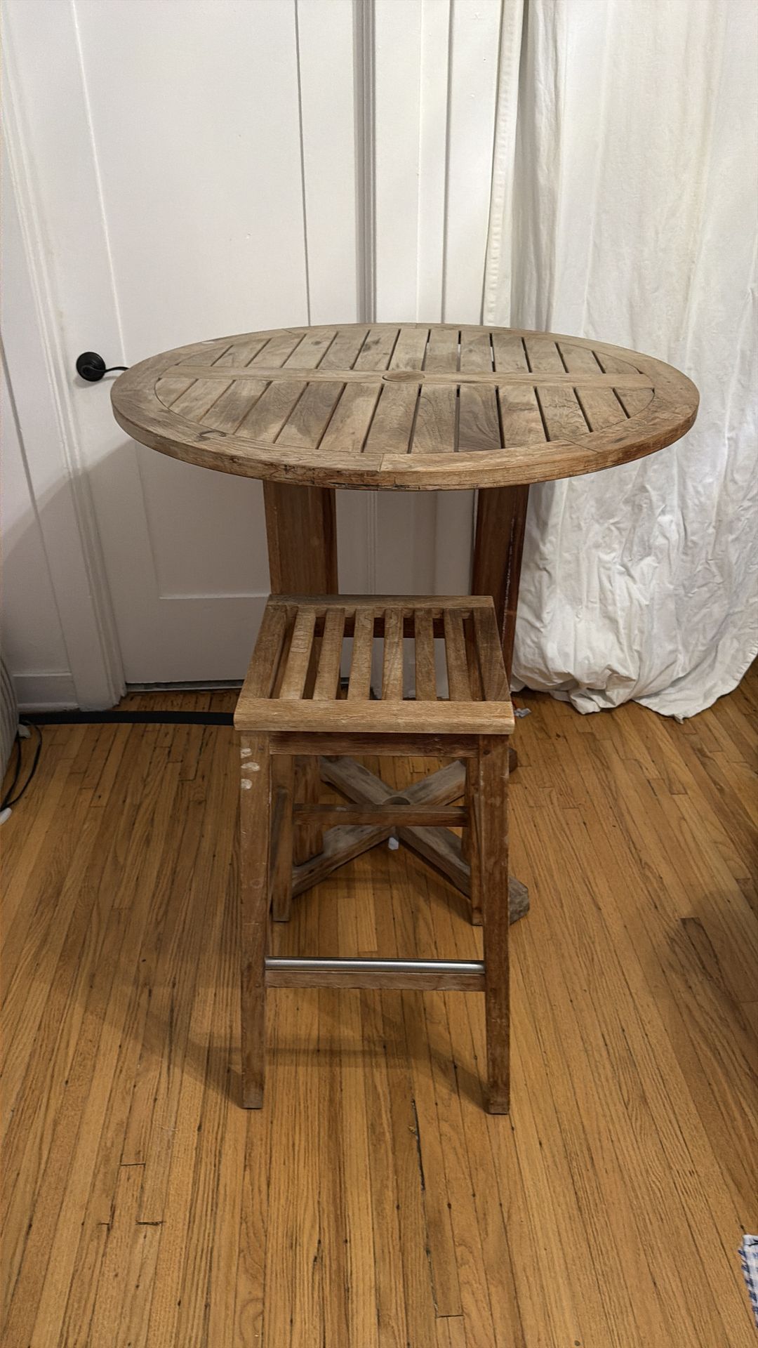 Gloster round table and bench. Original price $500 Table 36 inches / bench 14x29inches Real, pure, solid,strong wood. Will last a lifetime. Needs some tender love, Must pick it up!!Firm price