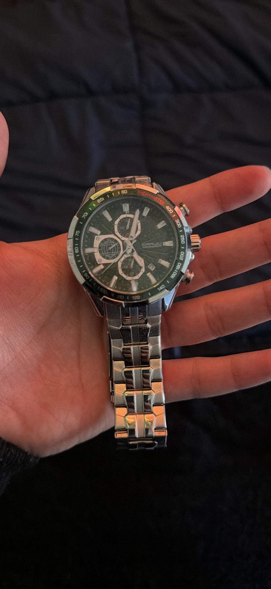 Stylish men’s stainless steel watch with a bold green dial and chronograph design. Great everyday piece or for dressing up. • Clean, modern look with tachymeter bezel • Stainless steel band (adjustable links) • Chronograph-style subdials • Date display • Quartz movement (battery-powered) • Comfortable and durable