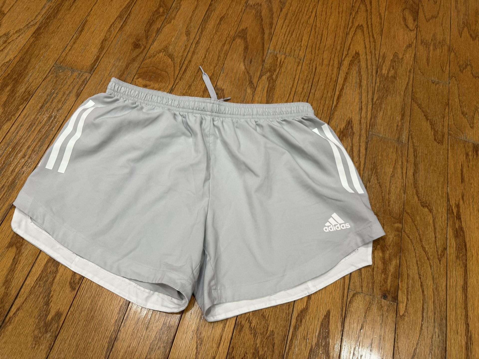 Women’s Adidas Running Shorts - Excellent condition, Adidas brand, white and light gray coloring. Lightweight running short material, no underwear lining, elastic waistband with drawstring, Aeroready style, size large (fit a little smaller), 3” inseam.