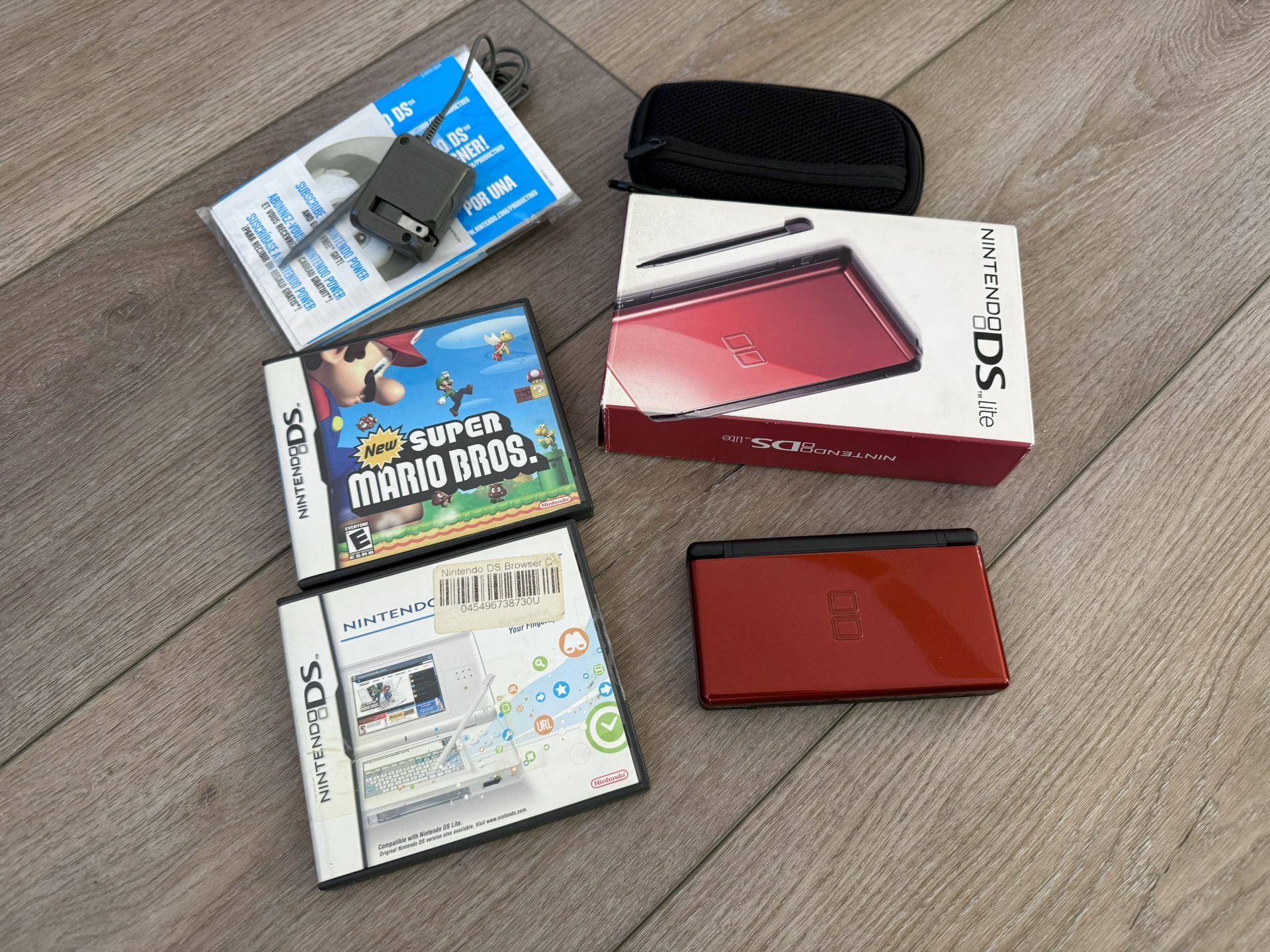 Mint complete set . Rare Crimson Red. Includes Super Mario Bros game, browser kit, and NDSTT card with many extra games. Mortal combat, 2 Tony Hawk games, iPod app, madden 2008 and more