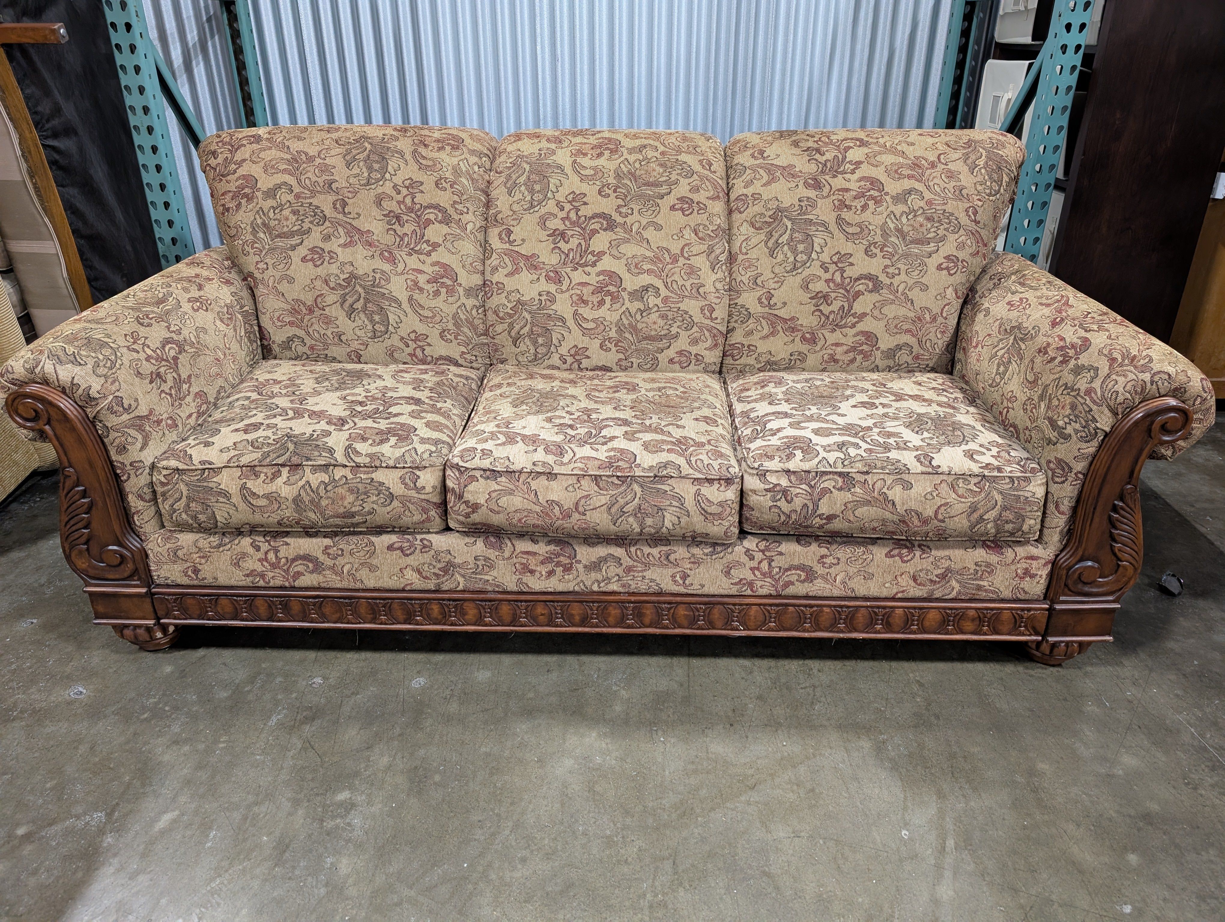 It features a woven floral pattern fabric in tan, brown, and rust colors, complemented by a richly carved wooden base and rolled arms Dimensions 87"x 40"x 38
