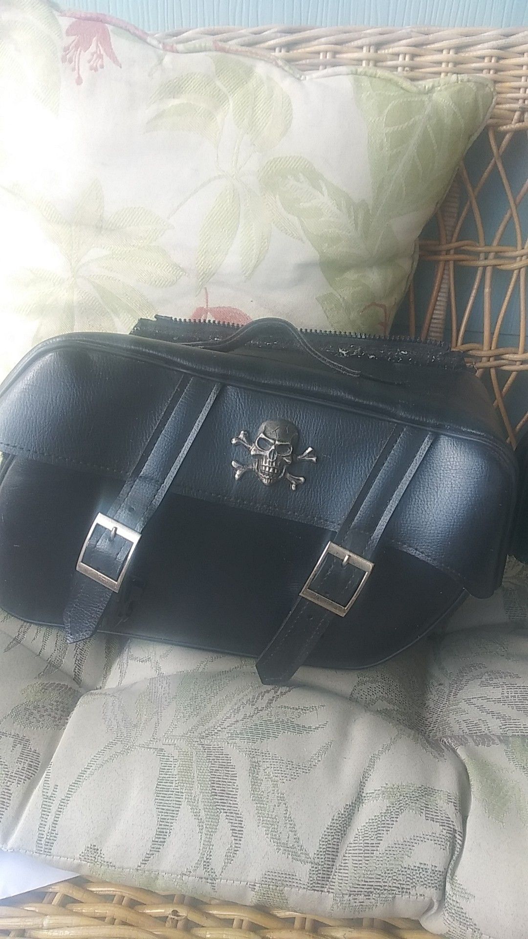 Two black leather bags usually used for motorcycles. Strap missing that slings over bike. Great shape.
