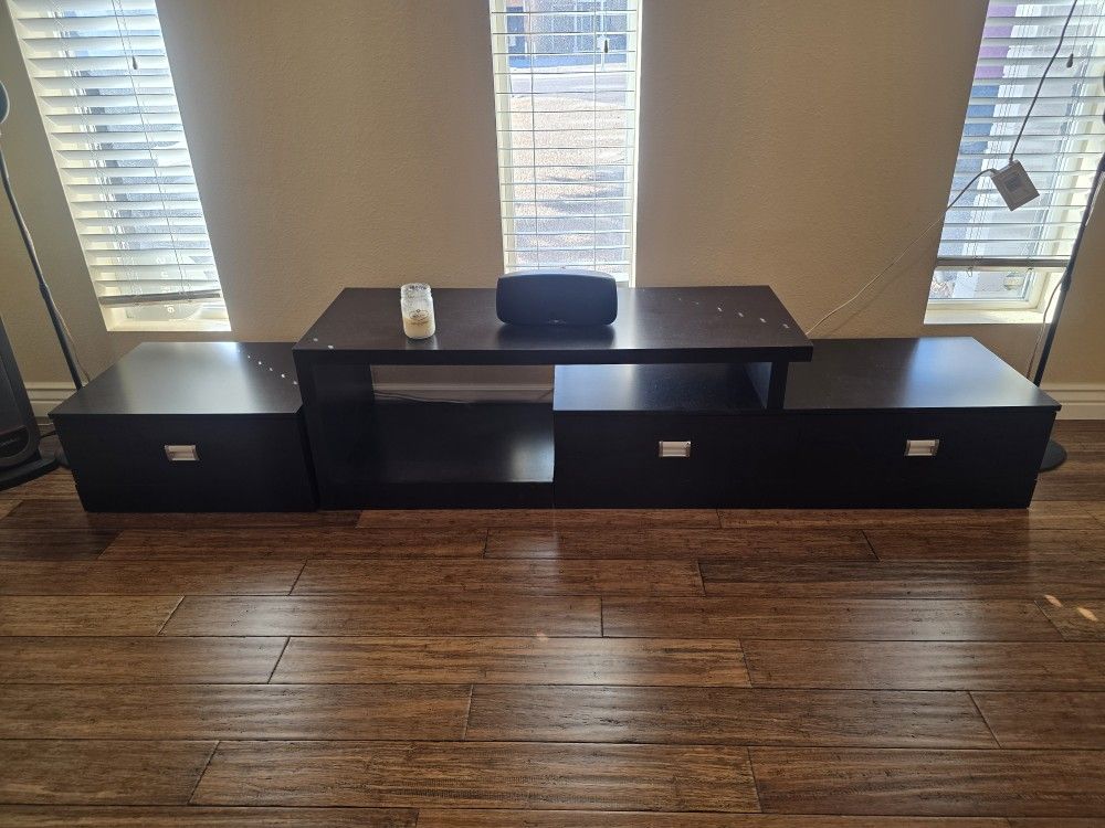 Product Details: 18''H x 94.37''W x 17.75''D Weight capacity: 150 lbs (tabletop) Drawers: 5''H x 20.1''W x 15.1''D Wood Wipe clean Can deliver for a fee, depending on the distance.