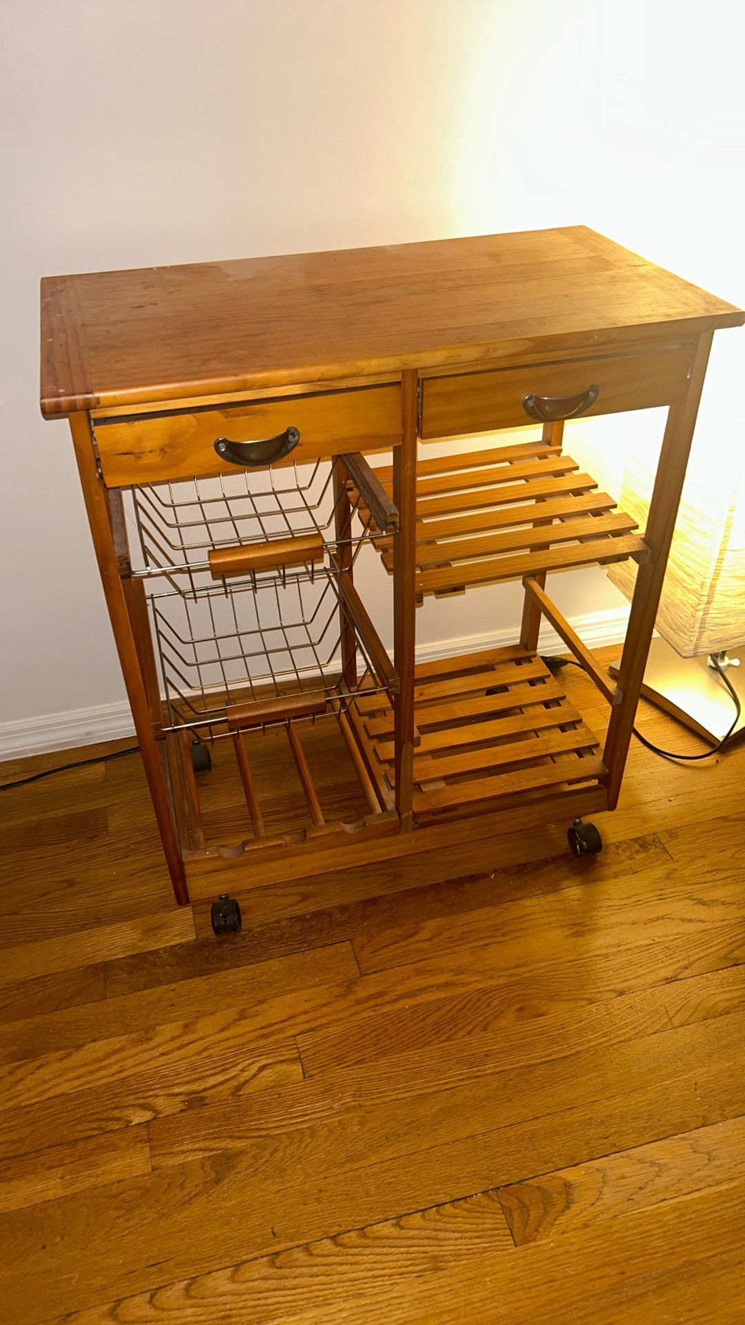 Wood kitchen cart with drawers, baskets, shelves, and wheels. Local pickup only. Approximate measurements: 26 x 15 x 29 inches