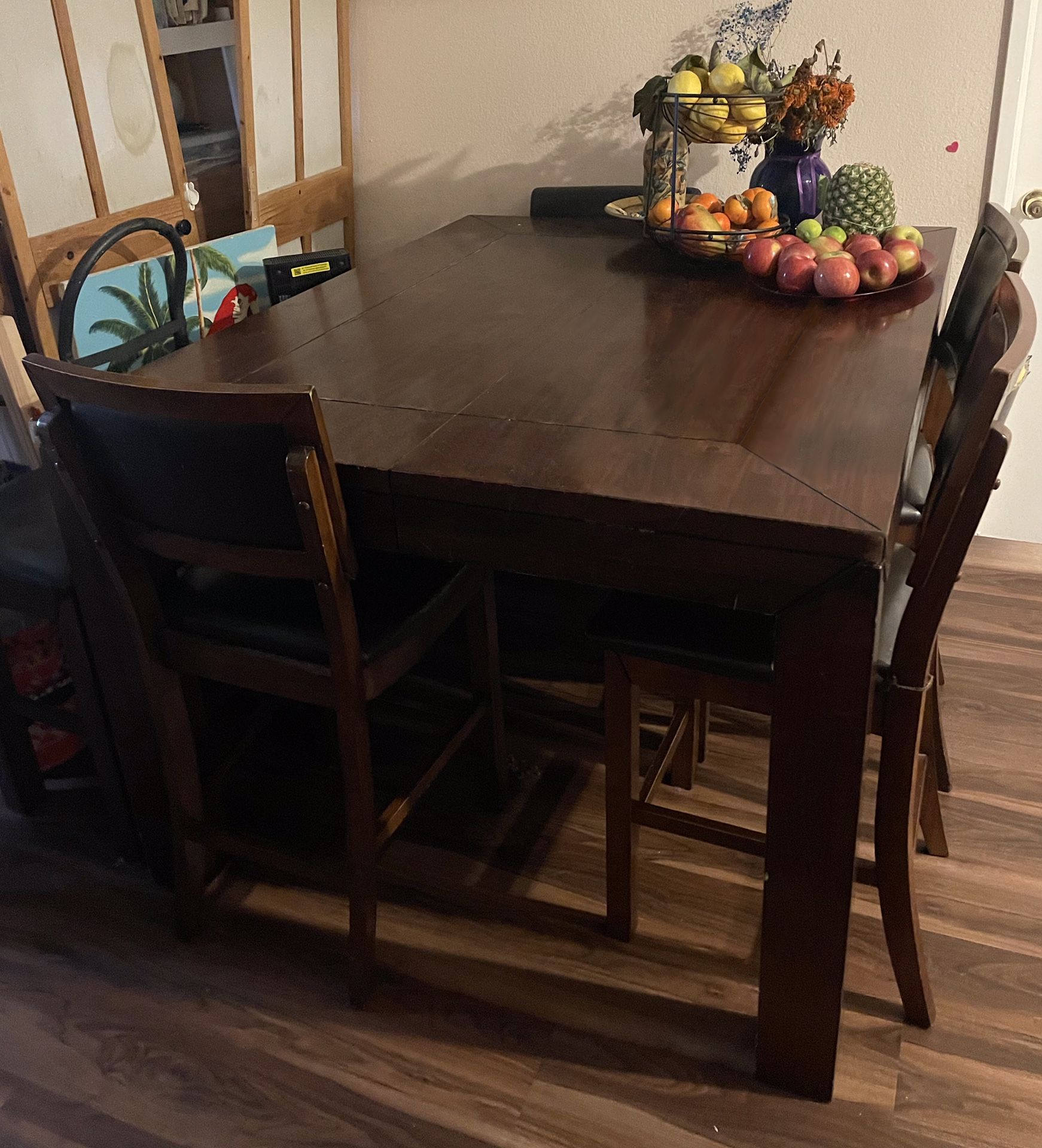 Very strong, durable table chairs and bench. This table extend another 12 in longer. The table comes with 6 chairs and one long stool. Measurements are: Length 60 in / Width 48 in / Hight 38 in. Comes with 6 chairs and a bench. Seats are leather. Normal ware. Good condition. Most go. Need space.