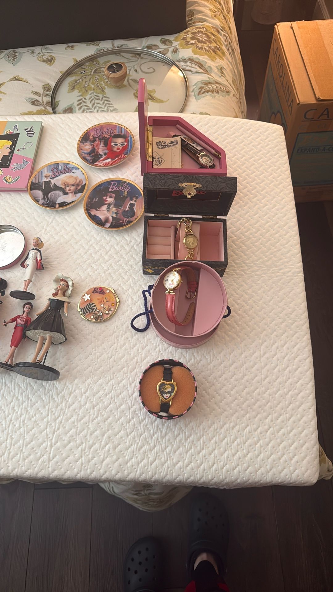 4 watches, compact mirror, 4 small plates, 2 unopened Barbie keychains, calendar 2005 unopened, scarf, consumers bag and 9 Barbie stands. All I. Excellent condition