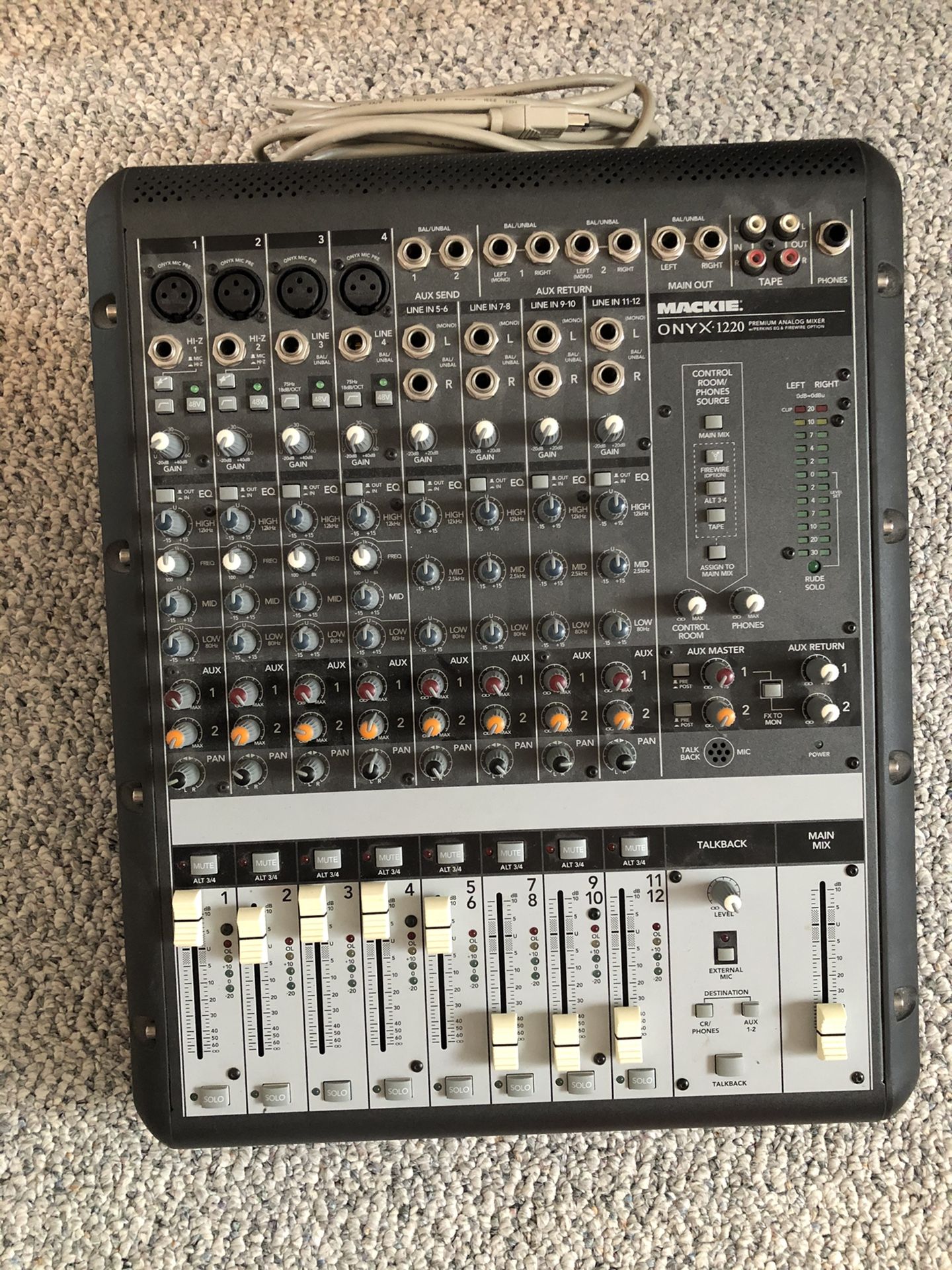 Really great condition, only used in a studio, so no moving around to gigs and such. The premium Mackie Onyx 1220 12-Channel Mixer is a small-format analog mixer featuring all-new circuitry. Includes 4 boutique-class Onyx mic preamps with 3-band Perkins EQ plus sweepable mids on mic/line channels. A 96kHz FireWire card included for streaming 14 independent channels of audio to computer with near-zero latency. Other features include aux sends with pre/post switches, 4 stereo line-level inputs, a talkback section for use with internal or external mics, true hardware EQ bypass, and a Planet-Earth switching power supply for worldwide use. Other features include individual 48V phantom power switches on all mic inputs; 60mm logarithmic taper faders for smooth, linear fades; and balanced direct outs for every channel via DB-25 connections. Selectable instrument inputs on the first 2 channels means no DI boxes are needed. FEATURES 4 stereo line-level inputs 2 aux sends Built-in Talkback section for use with internal or external mic True hardware EQ bypass "Planet-Earth" switching power supply for worldwide use Individual 48V phantom power switches on all mic inputs 60mm Logarithmic Taper faders for smooth, linear fades Balanced direct outs for every channel via DB-25 connections Selectable Instrument inputs on first 2 channels”no DI box needed