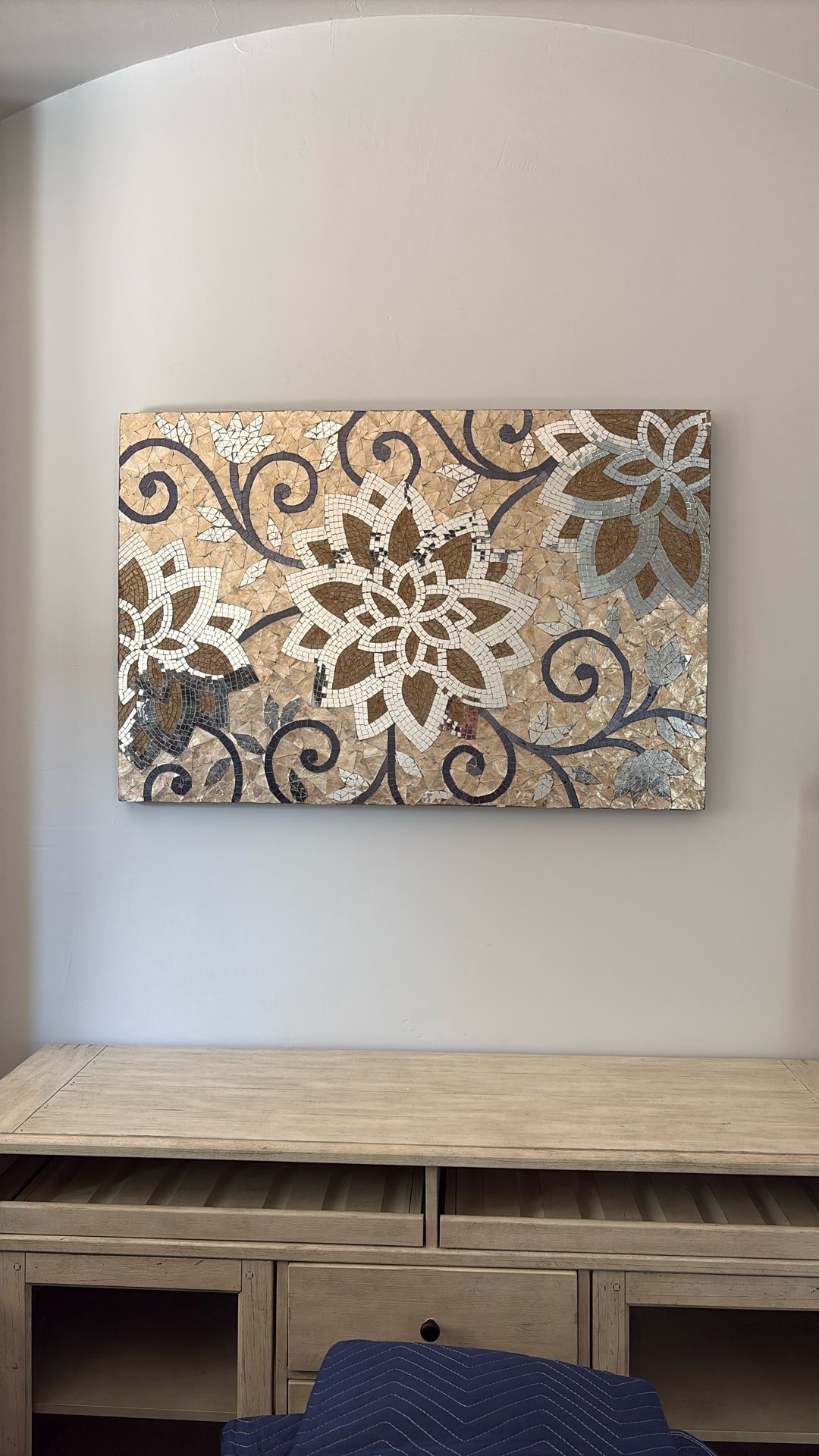 Beautiful glass mosaic 48” x 32 Some of the pictures look like glass pieces are missing, but they are not. It’s just the reflection.