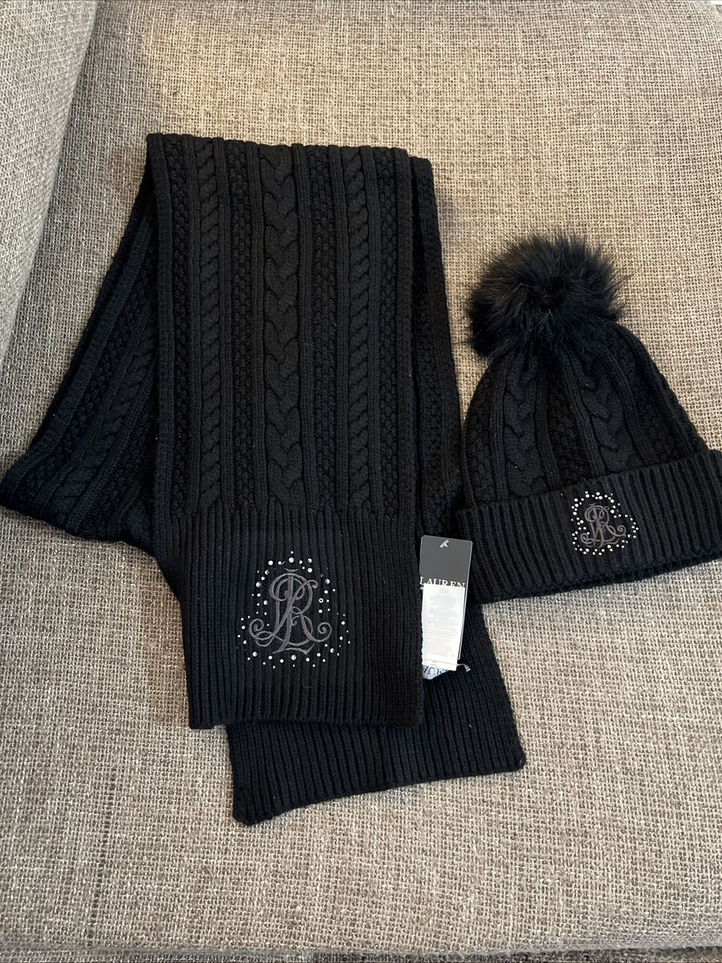 Ralph Lauren women's Stone Logo Cable knit Scarf & Beanie set -Black /nwt