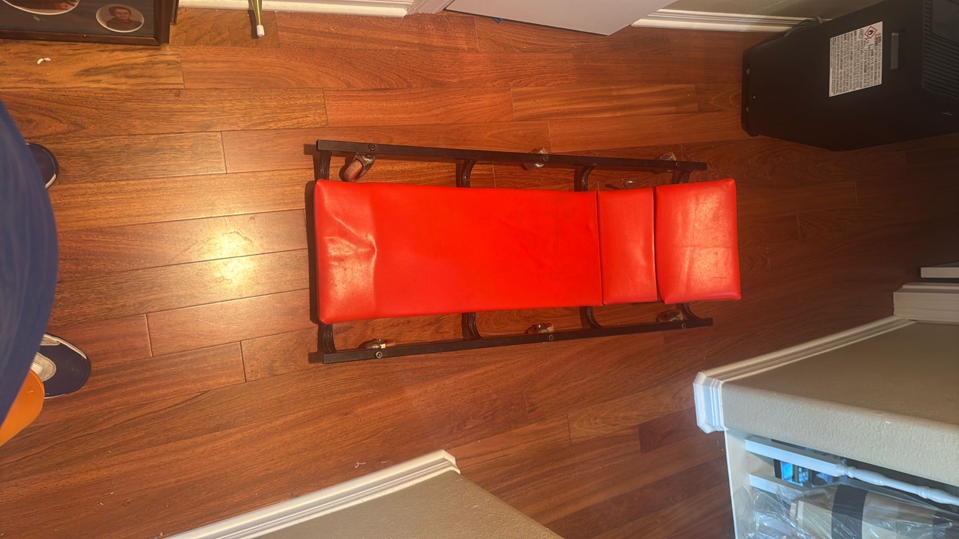 This is a vintage mechanic's creeper featuring a red padded surface and a sturdy metal frame. It is equipped with six wheels for easy maneuverability under vehicles.