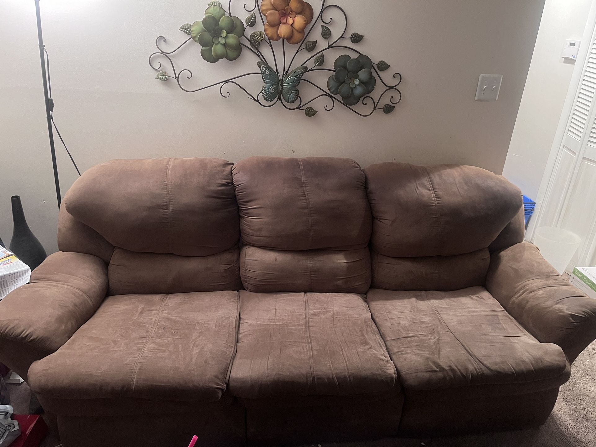 This is a matching set with reclining ends on the sofa. The fabric is microfiber. Must be picked up by today2/7. The price is $300 obo. CASH ONLY