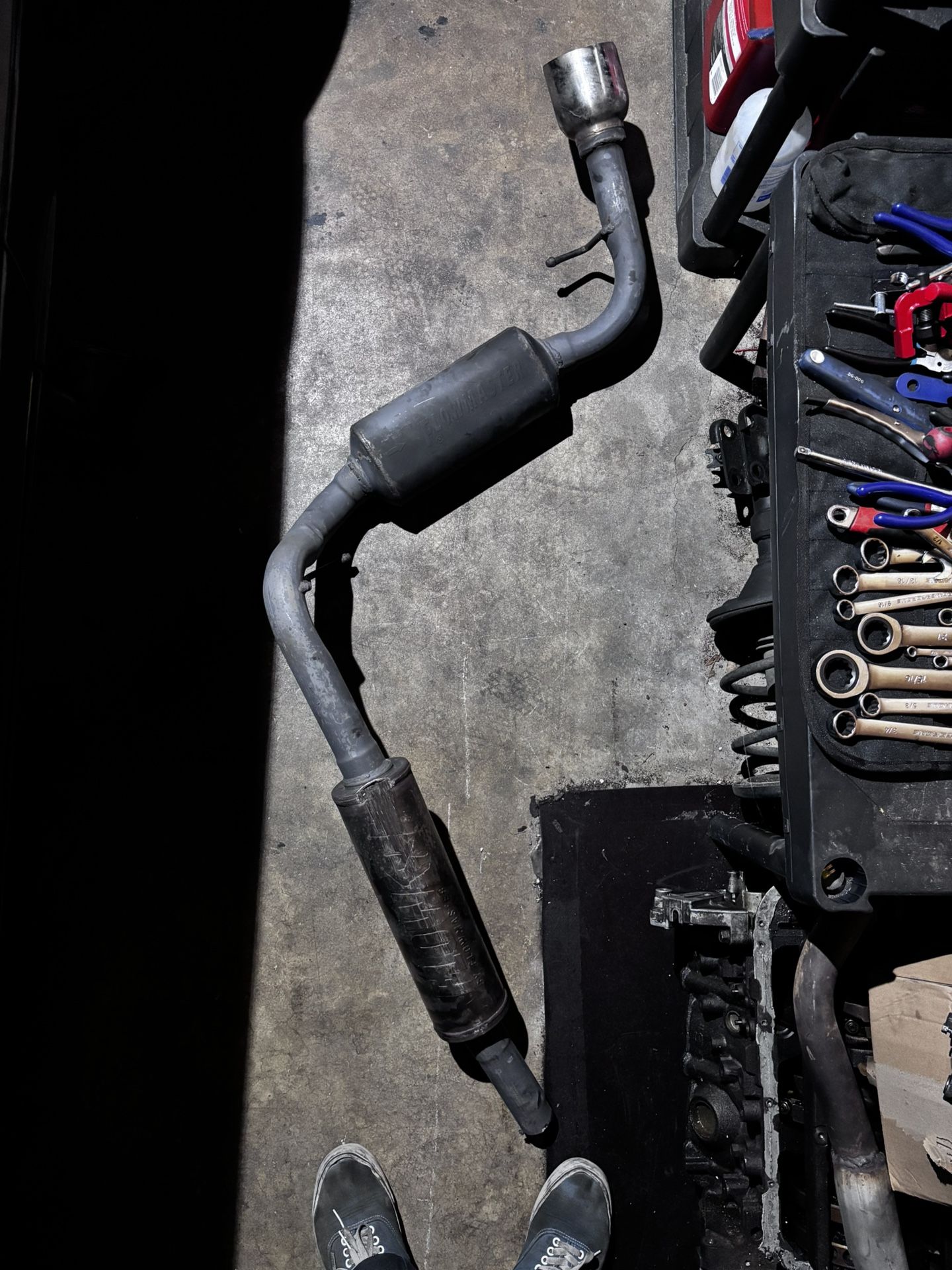 Flowmaster Muffler and Flowmaster Resonator with 3 inch exhaust tip. Removed from 1.6 NA Miata, can be used for various vehicles after cut and weld. Scraped while being towed by AAA but didn’t notice any leaks.