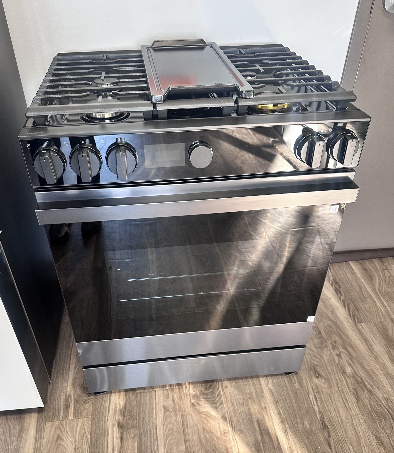 New Matte Black Steel Samsung Bespoke 6.0 Cu. Ft. Slide-In Gas Range with Air Sous Vide Model: NSG6DG8500MTAA Retail: $2,199.00 *open box appliance* Same day delivery quote available upon request. Comes with 1 year manufacture warranty! Don’t forget to ask about our interest free financing! Hablamos Español.. Samsung's smart gas range features a stylish and contemporary Bespoke design with a recessed handle that seamlessly blends into your kitchen for an elegant and minimalist look. Air Sous Vide locks in flavor and moisture so you can enjoy gourmet cooking at home and Air Fry built into the oven lets you cook healthier fried food
