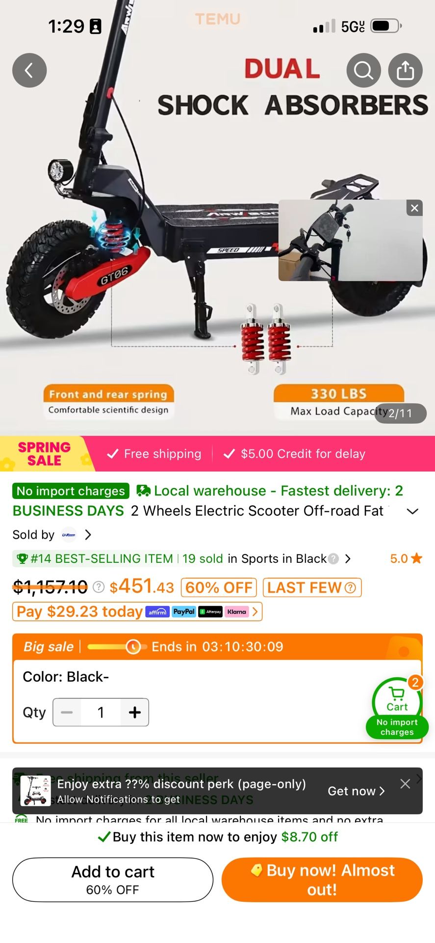High quality sports electric scooter. Bought on Temu for $461 when great discount offered (originally over $1000) The headbar is not able to be adjusted, and it’s not working for me. I missed out the refund window time. Now sale for $350. Note that only good for men with height over 5’7”. Everything else is perfect.