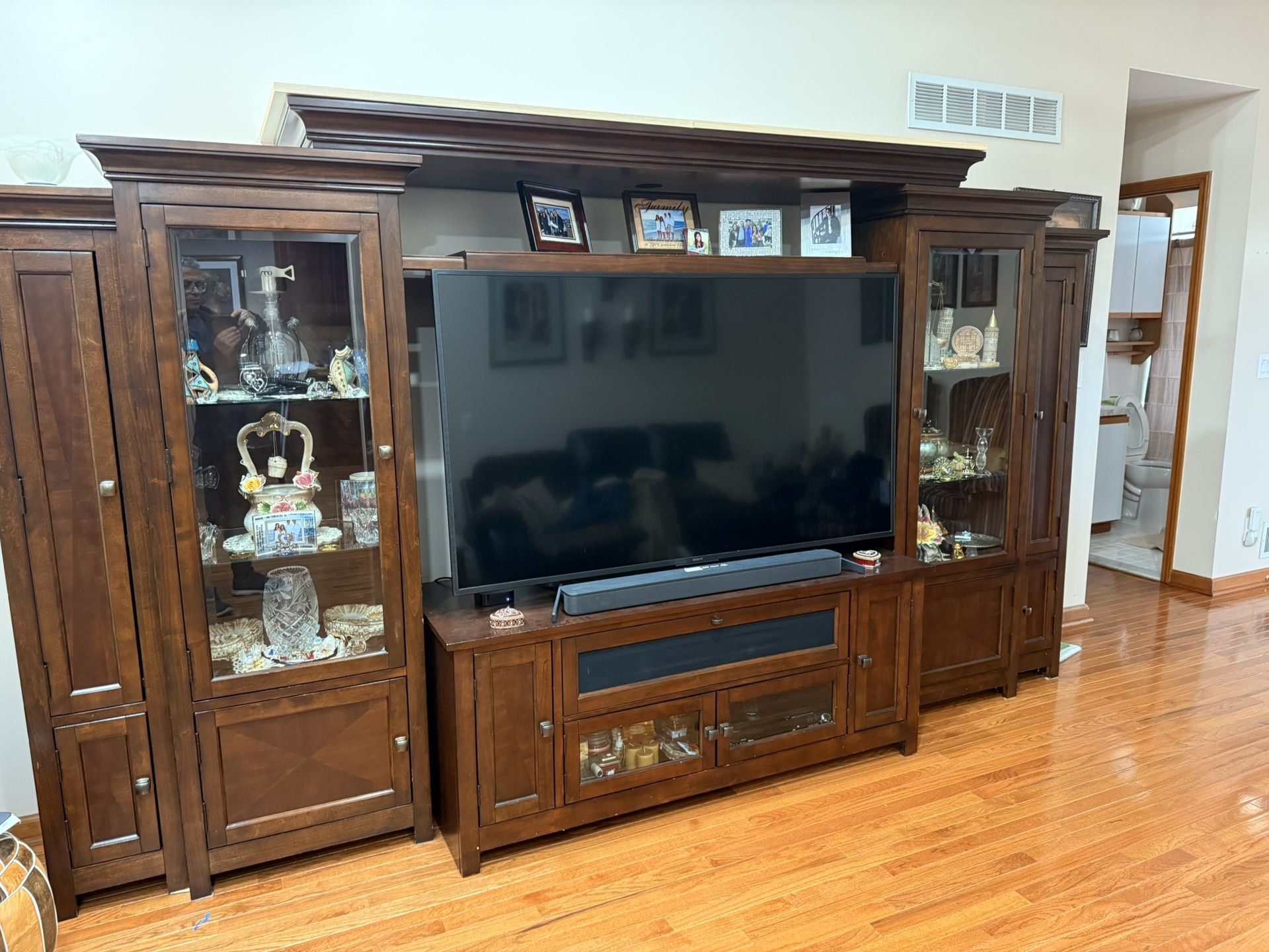 The TV stand is 62 inches by 22. The bridge on top can extend another 18 inches to fit a bigger TV if needed. The glass part on the side where the bridge sits is 24 inch by 18 and the outside. The last part on each side is 16 by 11 and those are completely detachable if you want to place them in a different part of the room. The glass part include built in lights