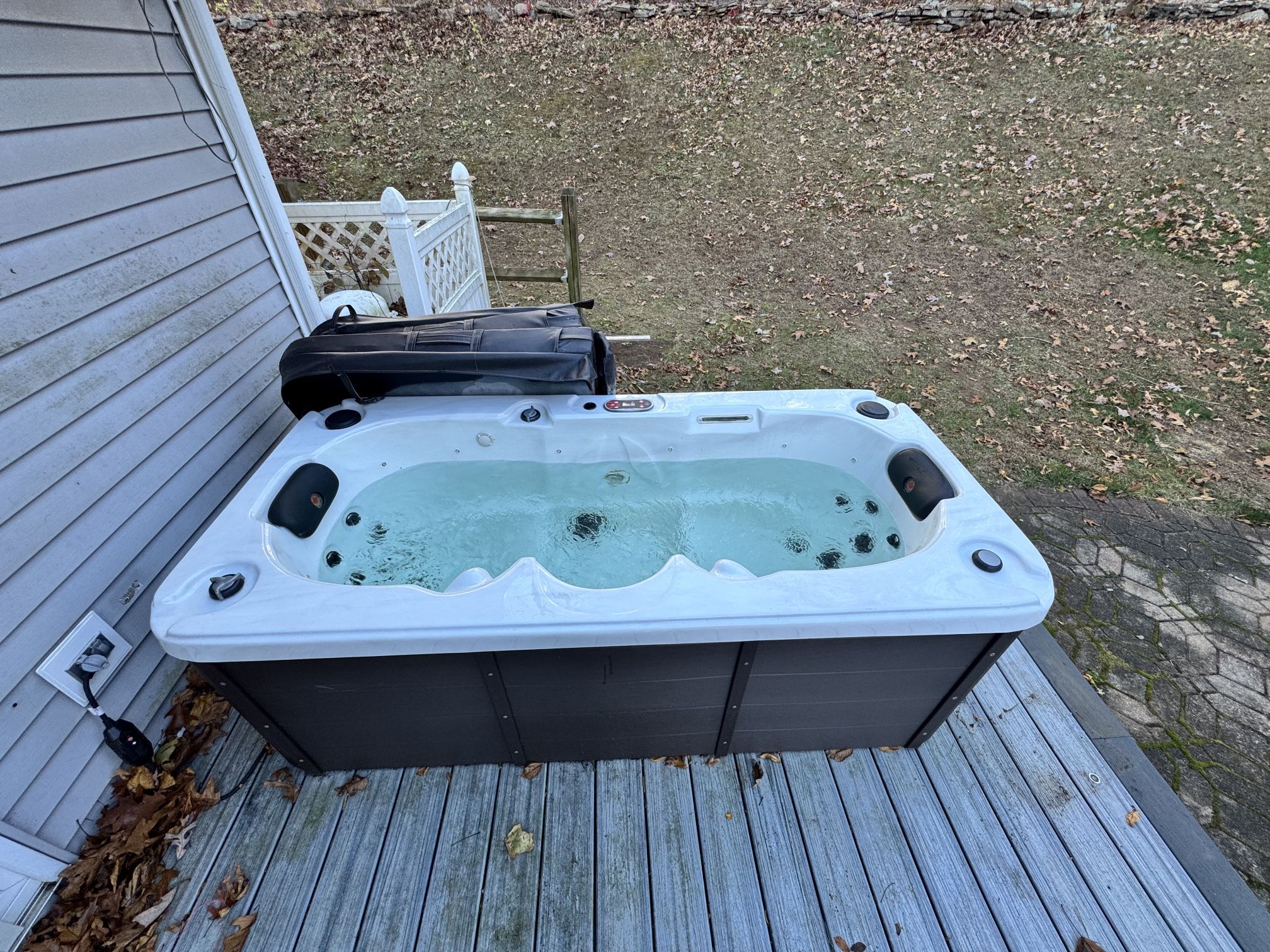 Plug into your AC plug!! Only 300lbs empty m, so it’s easy to reposition (like a large refrigerator ). Only 250 gallons so water refresh is quick and easy. Enjoy this during the best time - fall, winter, spring!! The Yukon Plug & Play Spa is the perfect hot tub solution for small spaces or condo living. With two deep, ergonomically designed seats, this spa is both comfortable and efficient, offering 16 adjustable hydrotherapy jets to massage and soothe every muscle and precisely target areas in need of relief.Our advanced Glacier filtration system, complemented by an integrated AO3P water purification system ensures your water remains crystal clear while requiring minimal maintenance. The Yukon Spa embodies quality and convenience, delivering premium features without the premium price. Experience exceptional value with luxury features like perimeter LED lighting, Bluetooth audio, aromatherapy, and a tranquil waterfall, all enhancing your sensory journey.The Yukon plugs into a standard 15A outlet, eliminating the need for specialized electrical services. Its construction is both luxurious and practical, featuring weather resistant, synthetic wood panels, a durable, locking hardtop cover, and superior energy-efficient insulation tailored for the coldest climates. This ensures your spa is not just a luxury but a durable, low-maintenance retreat capable of withstanding the elements. Elevate your backyard with the Yukon Plug & Play Hot Tub - where comfort meets power, and relaxation is just a plug away. Features 2 deep seats that allow you to submerge your shoulders and hand grips to ensure you can easily get in and out of the spa. 16 adjustable and interchangeable hydrotherapy jets and air control valves allow you to completely customize your hydro-massage. Blackout insulation with high-density closed cell foam and a heat retention blanket surrounding the interior, providing your hot tub with insulation that traps and retains heat in the coldest climates. Includes a 13A 2 speed 2 HP pump with an oversized 2.5" intake, ensuring you receive strong, consistent, jet pressure and a 1.5kW Balboa heater. The Glacier filtration system combines silver ions and antimicrobial materials along with an Ozone Generator to fight bacteria growth while sanitizing and cleaning your water. AO3P enabled, UV bulb sold separately. Premium features include multi-colour LED lighting, a cascading waterfall, aromatherapy, a built-in Bluetooth Audio System. Includes a locking 5in/3in thermal hardtop cover. Also includes cover lift (never installed). OBO