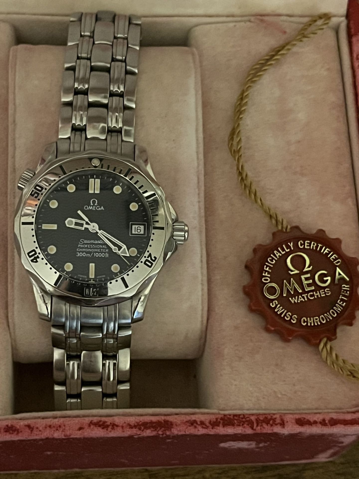 Omega Seamaster Professional 300M Automatic Chronometer – Full Set – Ref. 2552.80 – Extra Bracelet & Clasp For sale is a genuine Omega Seamaster Professional 300M Automatic Chronometer (mid-size) in excellent running condition, complete with full box, papers, and additional original Omega bracelet and clasp. This is the iconic wave-dial Seamaster from the classic Bond-era lineup, powered by an automatic chronometer-certified movement and built to professional dive specifications. ⸻ Watch Details • Brand: Omega • Model: Seamaster Professional 300M Chronometer • Reference: 2552.80 / 0(contact info removed) • Movement: Omega automatic chronometer (COSC certified) • Case Size: Mid-size ~36.25mm • Water Resistance: 300m / 1000ft • Dial: Blue wave dial with luminous markers • Crystal: Sapphire • Bezel: Stainless steel unidirectional dive bezel • Crown: Screw-down crown + helium escape valve • Bracelet: Original Omega stainless steel bracelet ⸻ Included (Full Set) • Original Omega inner red box & outer white box • Original International Warranty Card – dated 2011 • Chronometer Certificate booklet • Omega tag / seal • Original bracelet currently on watch • Additional genuine Omega bracelet • Additional original Omega clasp No trades, meetings at police station or a reputable watchmaker of your choice for authentic verification at your cost.