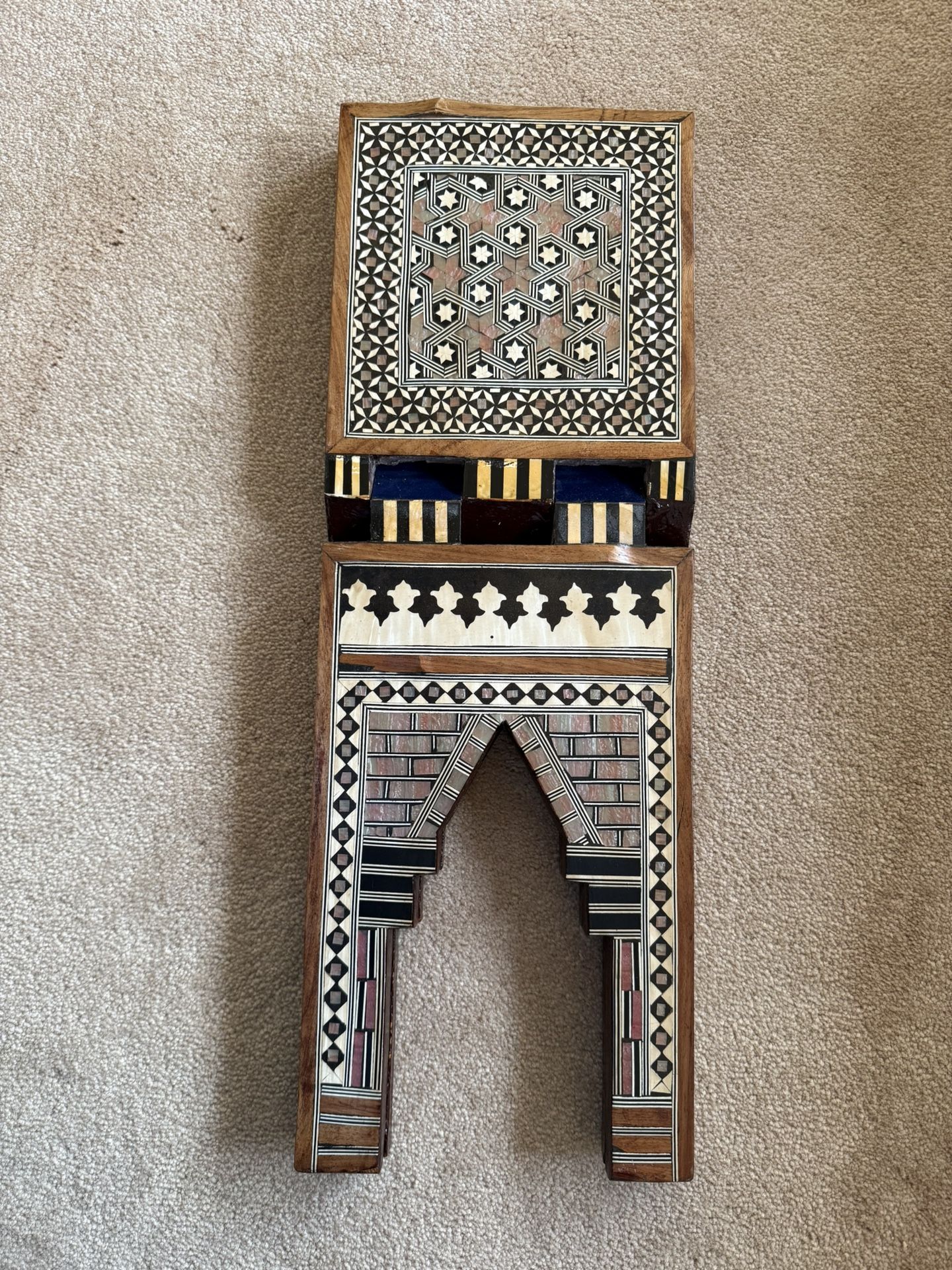 Egyptian handmade foldable book holder. Wood with inlaid mother of pearl. Import. Closed length 22 in by 8 in.