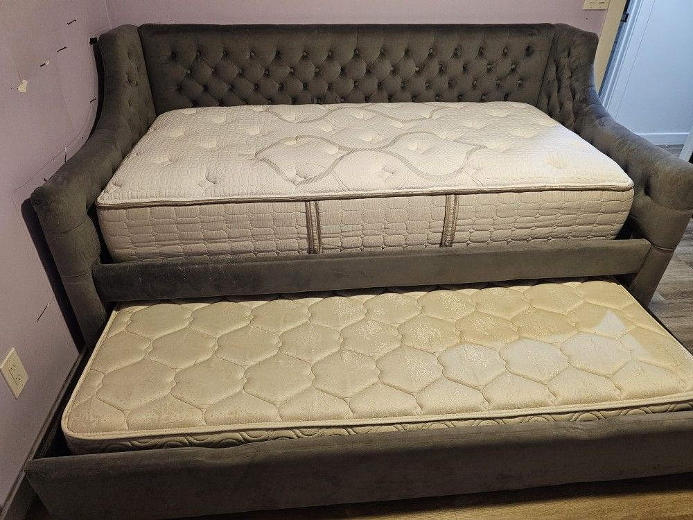 Beautiful gray twin trundle bed. Bed comes with both mattresses.
