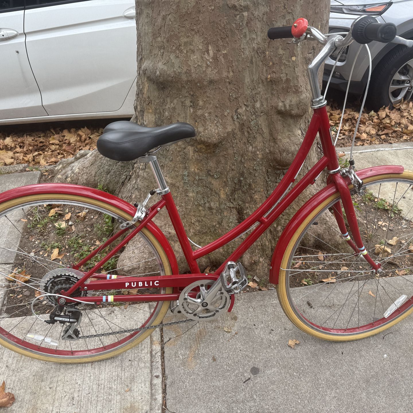 Excellent condition red Public Bike ready to ride! Size small/medium frame. Bell does not work but all else is great. Gears and brakes are good to go! No repairs made. Comes with a brand new red rear rack ($70 value), which is not currently attached and was not used. Pickup in Bay Ridge or Park Slope, Brooklyn. From the public website: The PUBLIC C7 is our modern interpretation of the iconic Dutch city bike—an enduring design trusted by riders across Europe. Equipped with smooth, reliable shifting and a versatile gear range, the C7 is ready to tackle hills from San Francisco to Seattle. Its step-through frame makes mounting and dismounting effortless, creating a graceful and practical design for everyday riding.