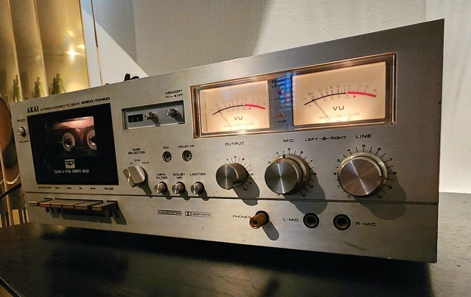 The main features of the Akai GXC-709D are: 2 heads, mechanical 3 digit tape counter and memory stop, manual tape type selection and capable of handling normal, chrome and ferro-chrome tapes, belt driven single-capstan transport. Typical front loading cassette deck with the cassette compartiment located on the left side of the deck. Tape eject is operated mechanically and the cassette needs to be placed with the side to be played facing forward in the cassette well. Level meters used on the GXC-709D are analog needle VU reading meters with peak indicator for easy adjustment of optimum recording level. Mechanical transport controls for reliable GXC-709D transport function selection. The Dolby-B system reduces tape hiss on tapes recorded on the GXC-709D by as much as 10 dB at the highest frequencies. The 19kHz multiplex pilot slgnal present in FM stereo broadcasts can cause false triggering of the noise reduction system. The switchable MPX filter of the GXC-709D filters out the pilot signal, and assuring proper Dolby processing of FM stereo programs. To make live recordings this deck has 2 microphone inputs to connect microphones with a jack connector. For undisturbed listening a jack connector for a pair of stereo headphones is supplied. Connection to other audio components for plaback can be achieved by a RCA cable and recording from a source by a RCA cable.