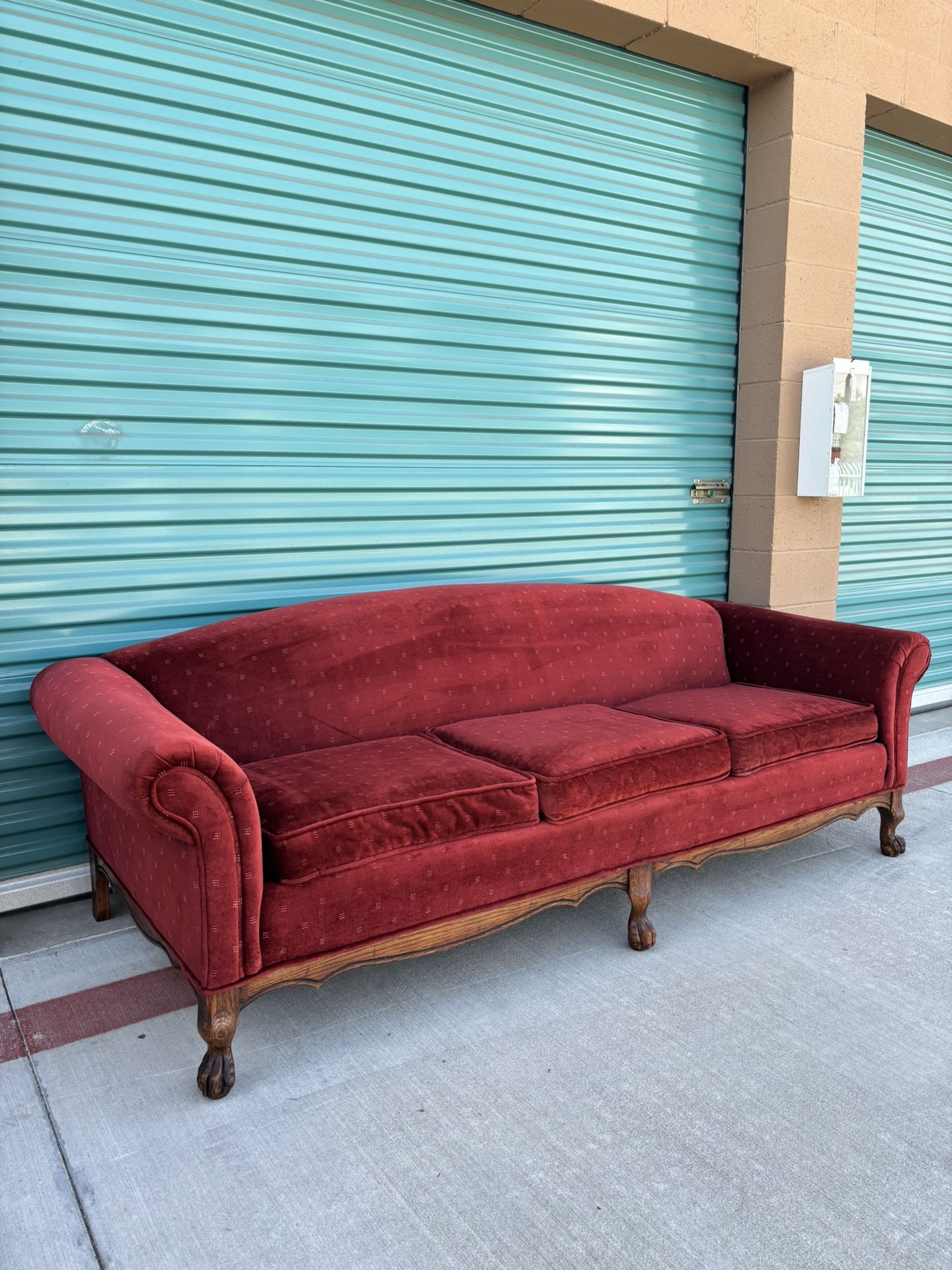 No sags or odors. Fully washed prior to listing 🧼 Hand carved claw feet w/ ultra soft velvet pattern fabric. Very sturdy and standout piece. Minor wear from time but overall this piece will surely last another lifetime! L: 93” x D: 35” x H: 30 1/2” Pickup in Corona but do offer FREE CURBSIDE DELIVERY @full price within 25 miles of 92879 area. If you LOVE what you see, DM a good time for delivery! If you’d like to come check it out in person first I am located in Corona. Appointment based only. DELIVERY AVAILABLE RAIN 🌧️ or SHINE ☀️ *Due to the nature of pre-owned/vintage items, everything is sold “as is,” with no returns accepted. Please inspect items carefully before purchasing. With any item we would be happy to supply more detailed photographs to assist in your decision making process.* *NO HOLDS UNLESS DEPOSIT SENT OR SAME-DAY TIME IS SCHEDULED* •If you need assistance to get into your home or apartment, please message to confirm if any stairs/elevator in your unit so I can estimate quote based on level of additional assistance• •Cash preferred but do accept Zelle, Venmo or Cashapp• (((CROSS-POSTED))) ***Check out my other listings***