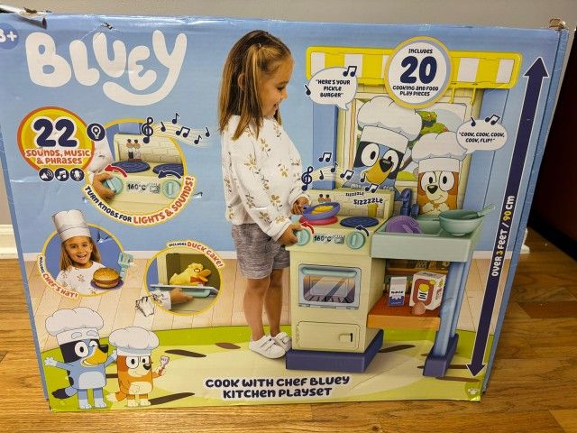 Bluey Kitchen Play Set for Kids Ages 4-8, 3ft Tall Pretend Kitchen Playset Stove, Sink, Oven & 20+ Accessories Chef Hat, Kid Play Kitchen