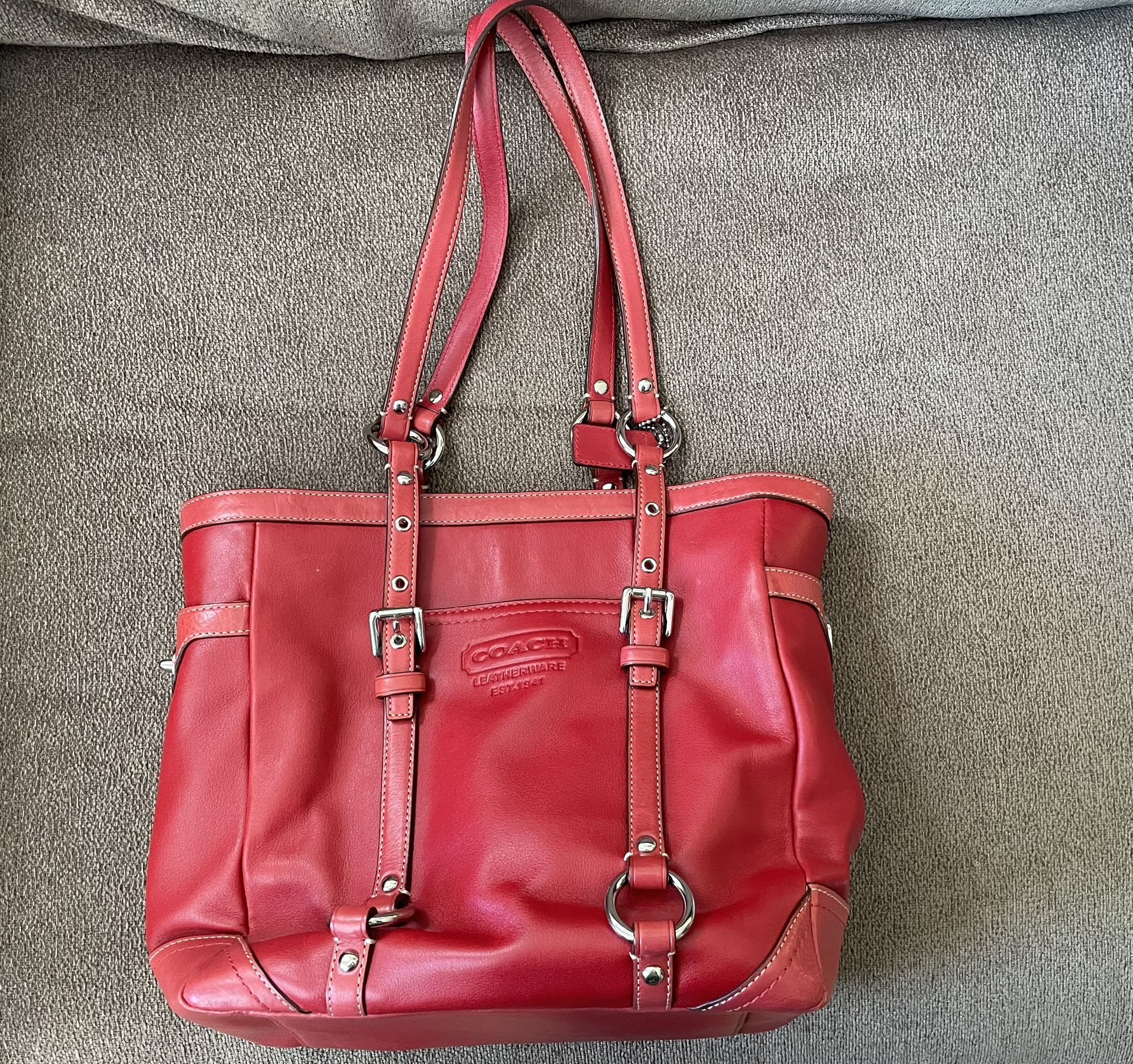 Preowned Coach Gallery lunch tote in red. Genuine leather, good condition, but see last photo for some discoloration marks on inside top of bag. Smoke free home. Flat bottom, zippered top, side pockets and inside pockets and pouches.