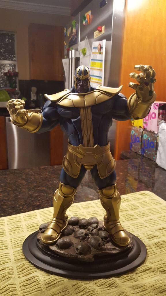 FIRM ON PRICE With his popularity reaching new heights thanks to his appearance in the Marvel Cinematic Universe, Thanos is the perfect new addition to the Fine Art Statue lineup. Always willing to get his hands dirty to further his own schemes, Thanos has arrived to unleash untold destruction on any who would stand in his way! The Mad Titan stands invincible on the battlefield, reveling in his own might as he sweeps away his foes with a clenched fist and the power of the Infinity Gauntlet. His massive frame is garbed in his iconic blue and gold costume, a segmented and reinforced bodysuit with armor plating, huge gloves and boots, a protective skirt, and a wide collar. All of that adds bulk to his already huge physique, and the amazing sculpt shows off both his musculature and the intricate details of his suit. And while Thanos’ fist may seem intimidating, it’s really his left hand that’s the most dangerous for it bears the Gauntlet, expertly recreated with the six differently-colored Gems. The only uncovered part of Thanos is his face, and you have two great options for your display: the Mad Titan giving a sly smile or baring his teeth in a fearsome grimace! Thanos stands an incredible 15 ½ inches tall in 1/6 scale as he poses on the skulls of his defeated enemies. Guaranteed to make a big impact in your collection, this Fine Art Statue is the quintessential collectible of the iconic Marvel villain.