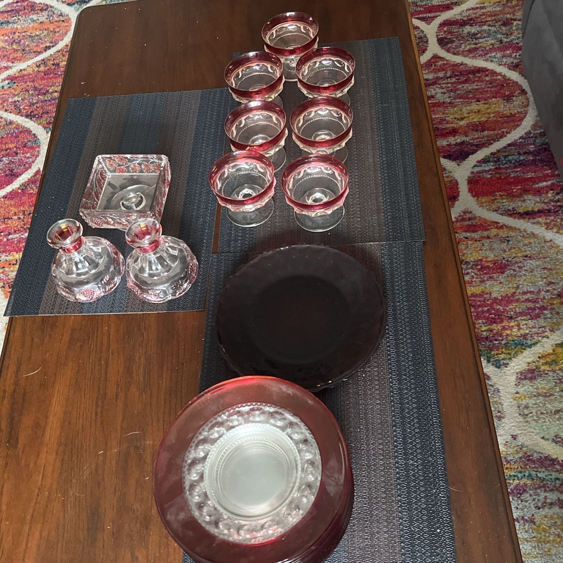 Don’t know anything about it. Some of the red is coming off a couple of the plates but not super noticeable with a red charger plate or table cloths below them. 10 plates 1 dark red plate 7 sherbet glasses 2 candle holders and 1 candy dish there’s a chip on the one plate that doesn’t match but it’s small. Think the rest are good though