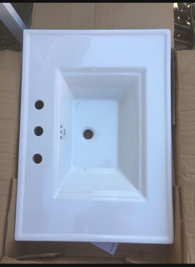 New/open box American Standard porcelain vanity top for a 30” by 22” vanity (actual dimension is 31” x 22.5 inch). 8 inch hole pattern. Model 0298008.020 Town Square.