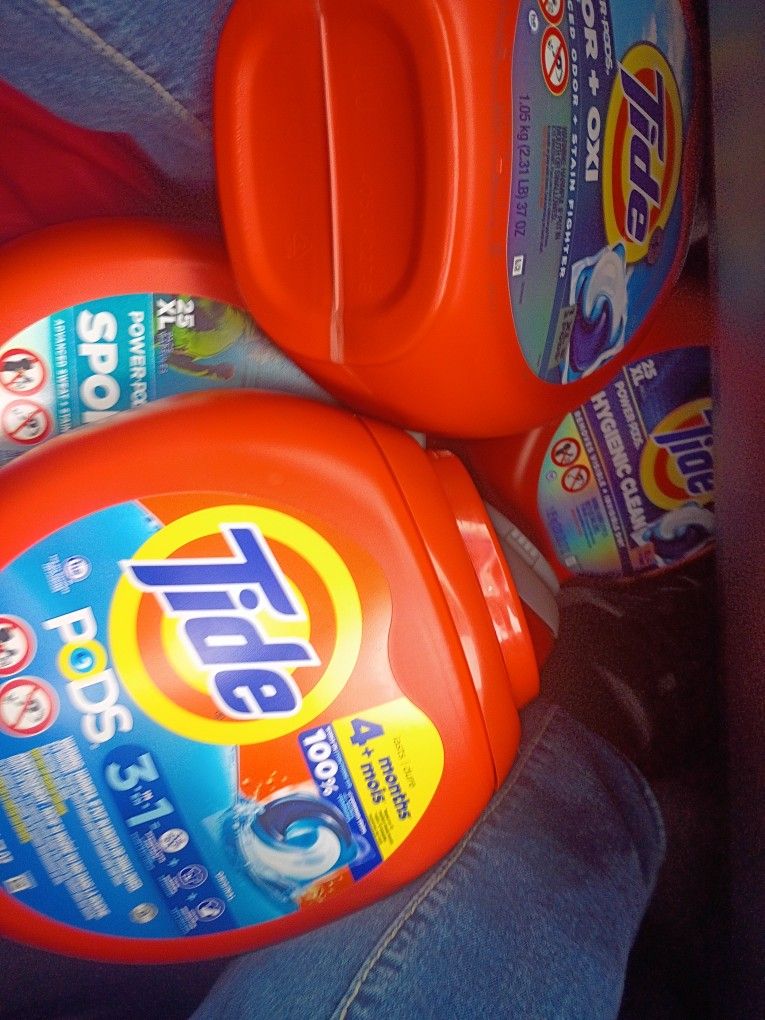 I have two sizes of Tide pods the smaller ones are $26 new in the store the bigger ones are 36$ new in the store. I sell the smaller ones $20 a piece or two for $30. The bigger ones are $30 a piece or two for $50. I have several of both let me know how many and what ones you want when you message me if the post is up yes it's available . Serious buyers only!! Ty