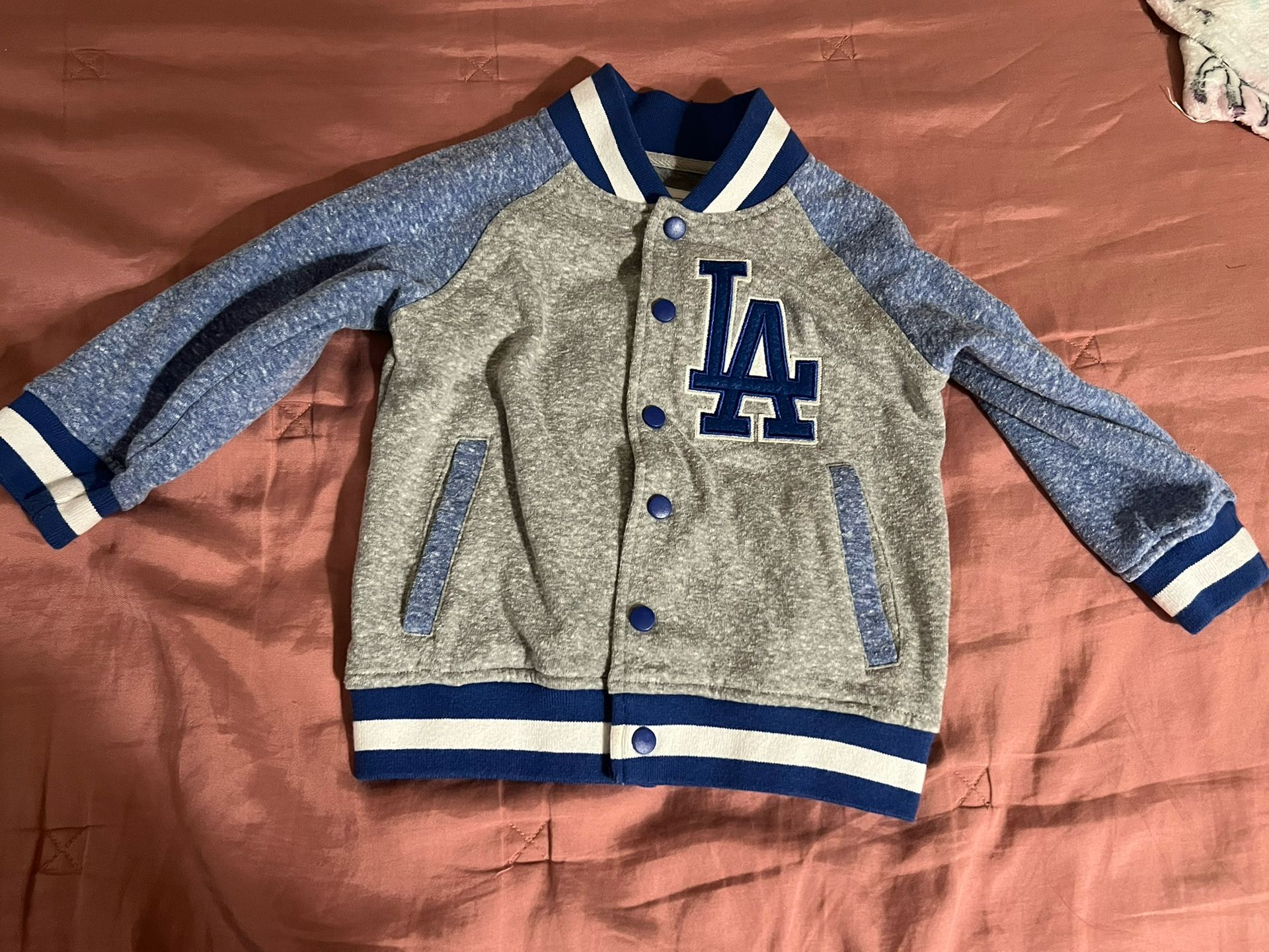 Cool jacket for little one. Has LA Dodgers logo on front. Grey body with blue sleeves. Blue and white striped collar, cuffs, and bottom hem. Buttons up front. Size 2T. $16 pick up in paramount or shipping available